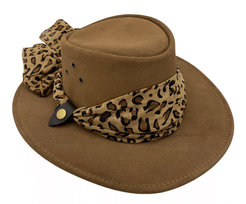 The Jillaroo is a genuine suede hat completed with a chiffon scarf for a feminine look. A stylish way to keep the sun at bay, whatever you choose to do with your day.