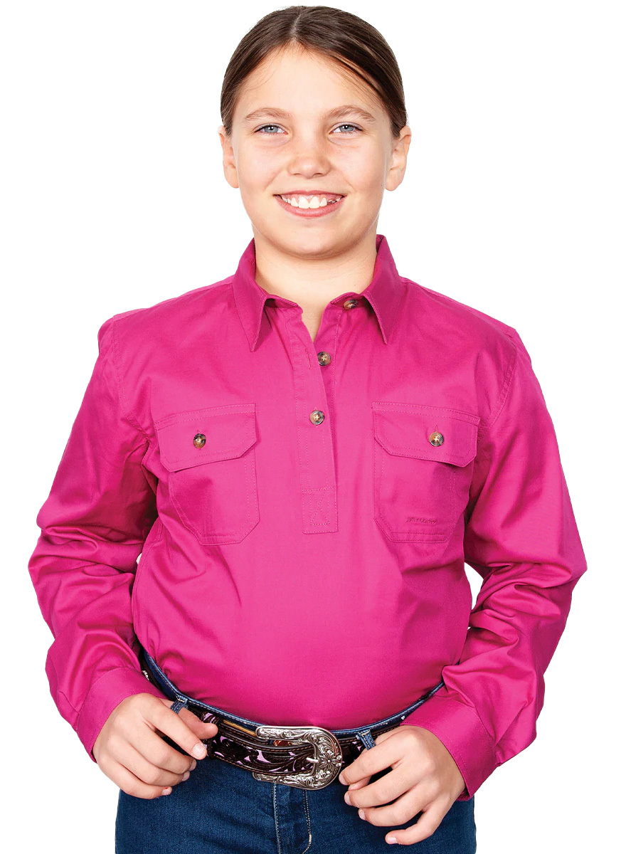 Well, now the kids can have the same style as the big girls! The Kenzie Half Button Work Shirt is crafted in 100% light-weight cotton fabric. It's the perfect shirt for kids on the land.