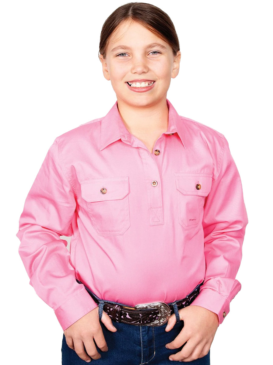 Well, now the kids can have the same style as the big girls! The Kenzie Half Button Work Shirt is crafted in 100% light-weight cotton fabric. It's the perfect shirt for kids on the land.