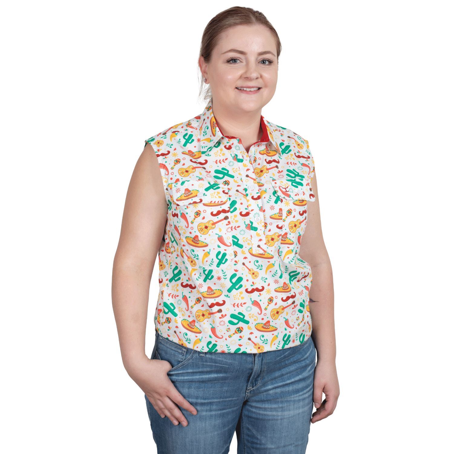 Just Country Womens Lilly Half Button Sleeveless Print Shirt (WWNSR242) White Cactus/Chilli 8 [SD]