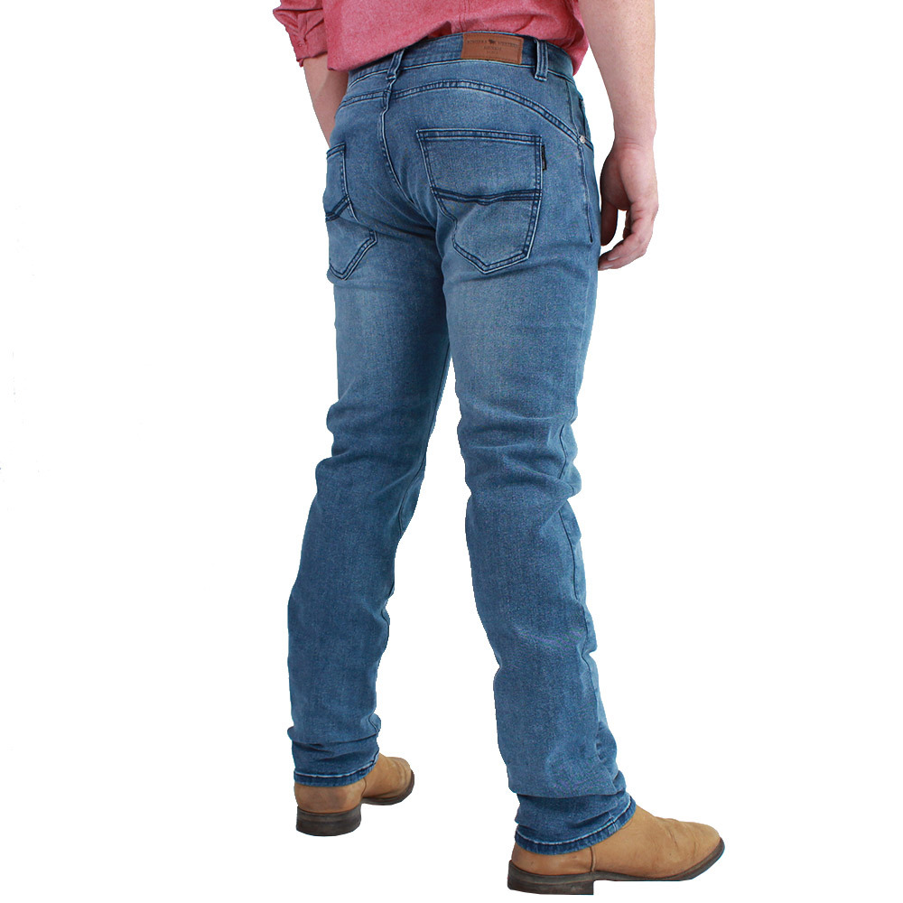 The Mitchell is a twist on the classic straight leg jean. This jean is cut in a light blue wash and is finished with stylish, navy stitch. Endlessly versatile, they'll hold up well at work and look great on the weekend. Made with a stretch denim for comfort and manoeuvrability.