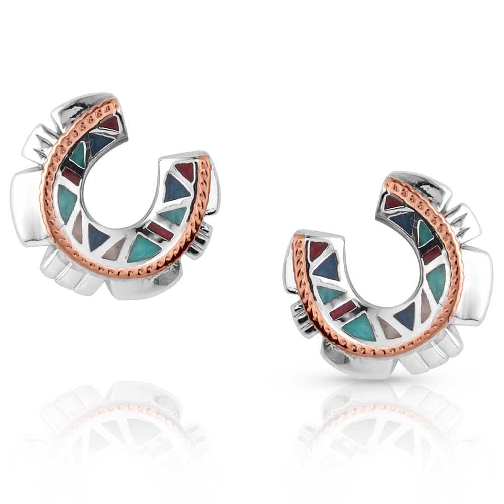 Take a piece of the West and a little luck with you wherever you go. The Western Mosaic Horseshoe Earrings are silver tone horseshoes with a rose gold tone twisted rope that goes through the center of the design. The outer edge of the horseshoe is smooth silver with cutouts creating an interesting and unique edge. Inside the horseshoe is a beautiful mosaic pattern of inlays of bold red, vibrant green, dark blue, and bright white reminiscent of a breathtaking Western landscape. Secured by hypoallergenic post back wires finish the incredible design.