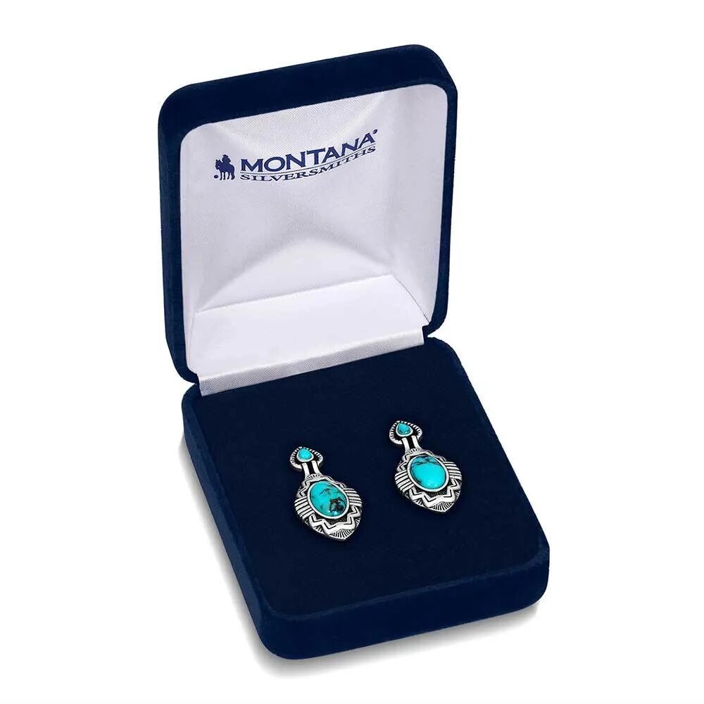 Add a Southwest feel to any look with these showstopping and bold earrings! The Blue Mesa Turquoise Earrings feature a gorgeous Southwest style etching in a beautiful silver tone that frames the center oval turquoise stone. A light antiquing shows the details in the design giving the earrings a more dynamic look. The oval piece hangs below a smaller teardrop shaped turquoise stone framed by open cut silver tone which secures the earrings to a hypoallergenic post back wire. Stone color may vary.