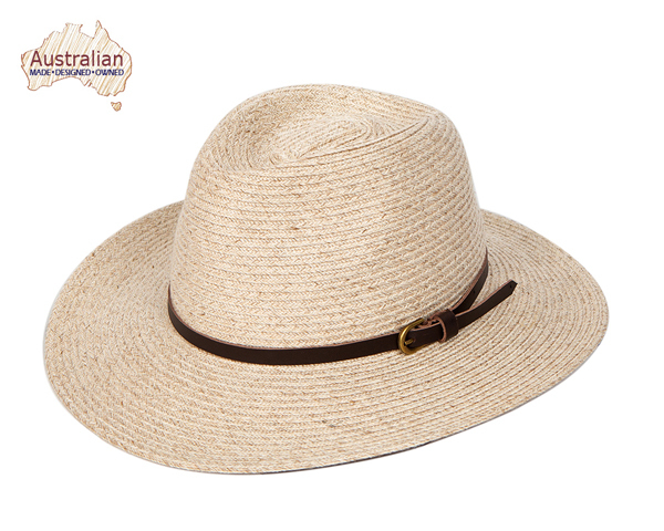 A flattering wide-brimmed sun hat made for men & women. The blended FLEXIBRAID® yarn creates an organic, textured look. Finished with a 1cm wide genuine leather belt with buckle around the crown. Made in Australia. Packable and travel friendly.