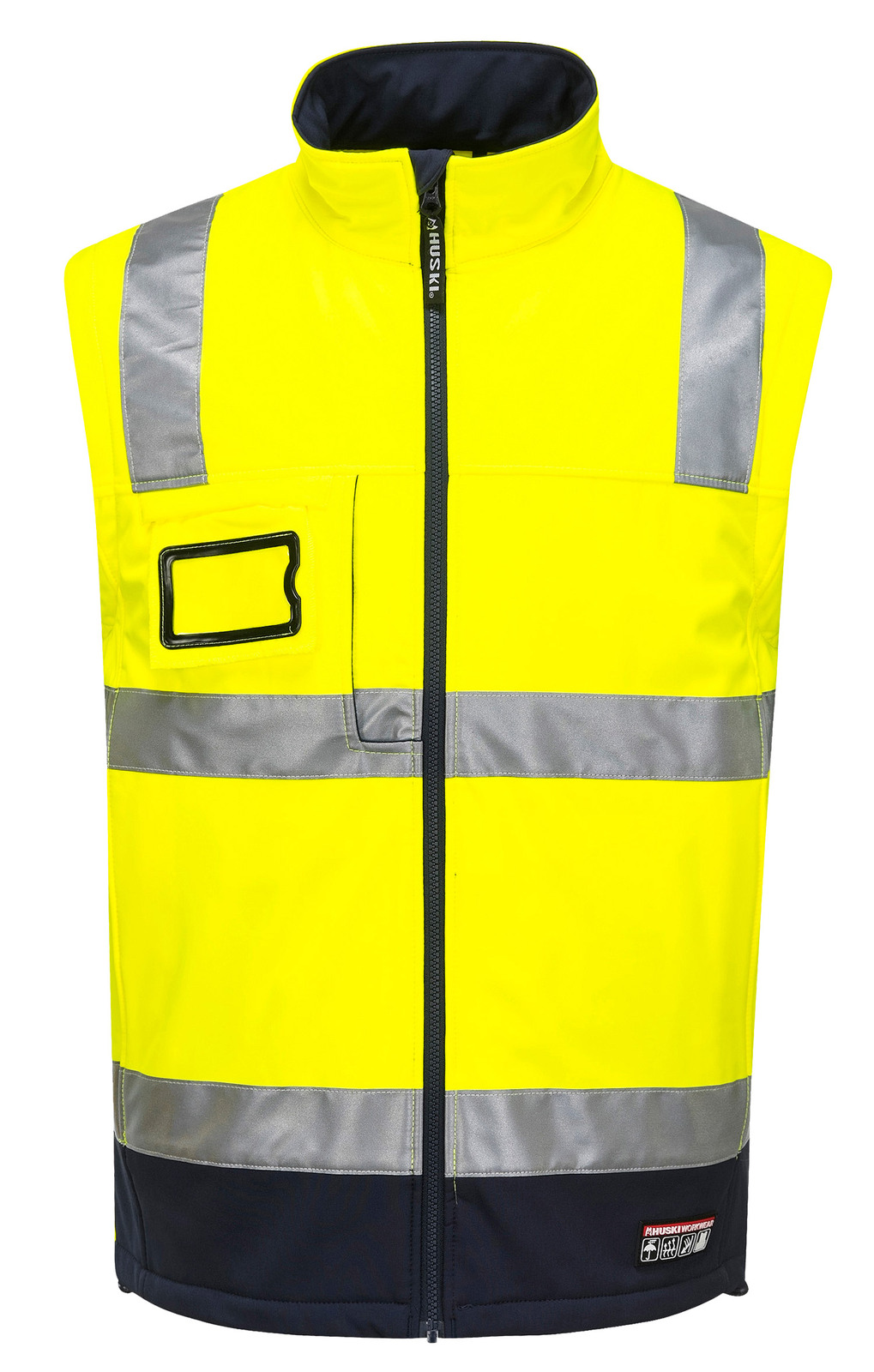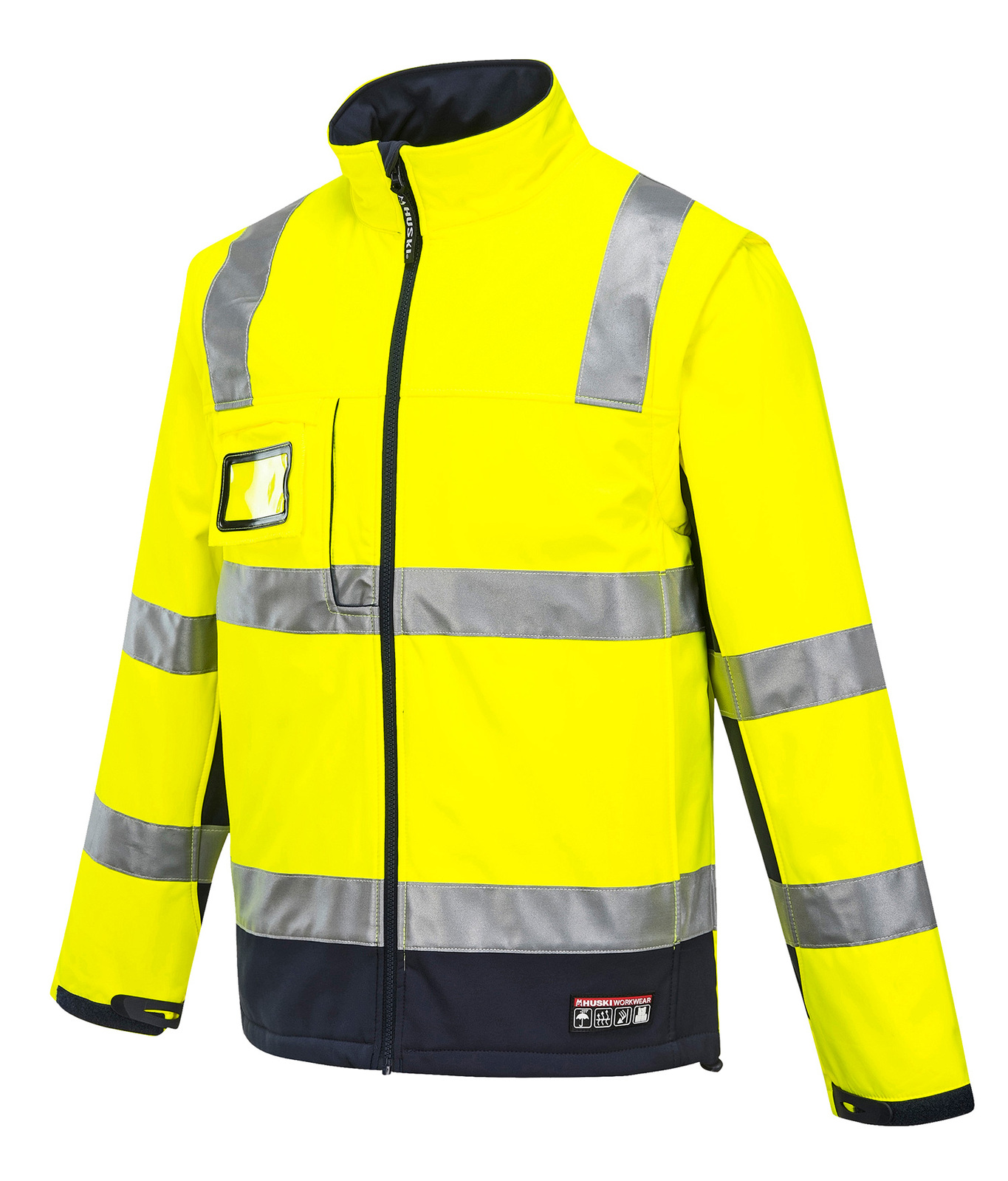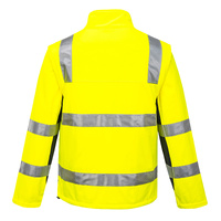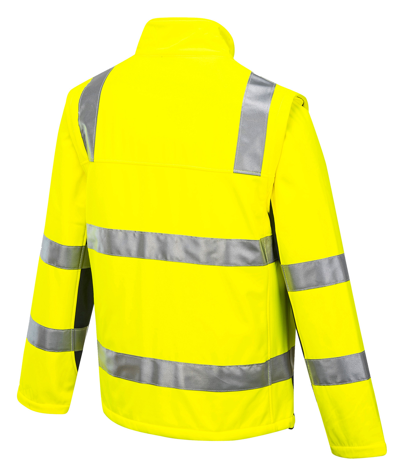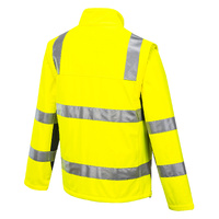 High visibility Softshell jacket with premium reflective tape. Features waterproof/breathable Breathetc™ layer in fabric, zip-off sleeves to form a vest, UPF50+.