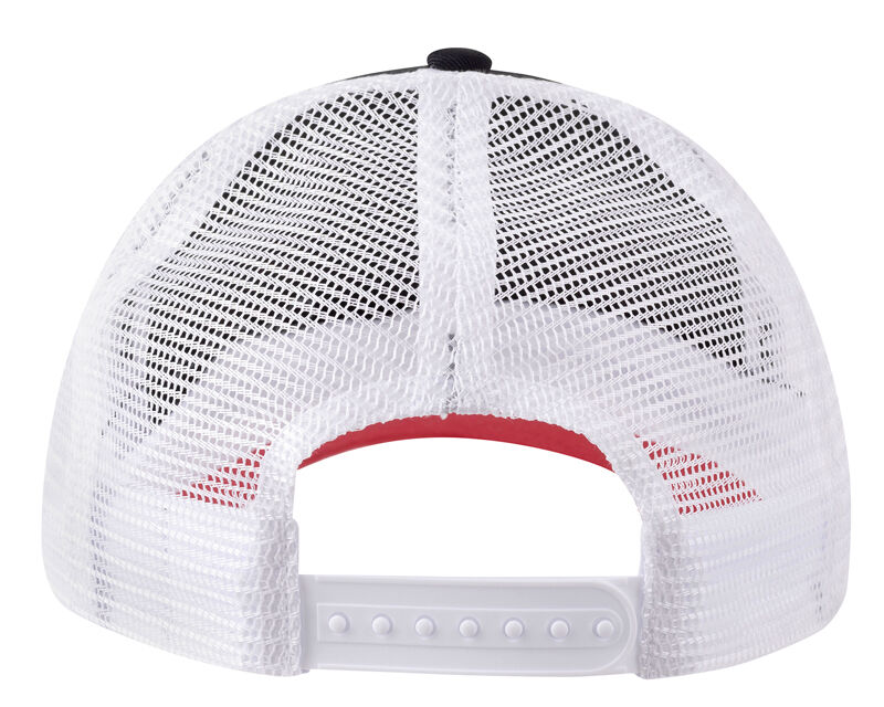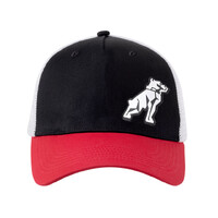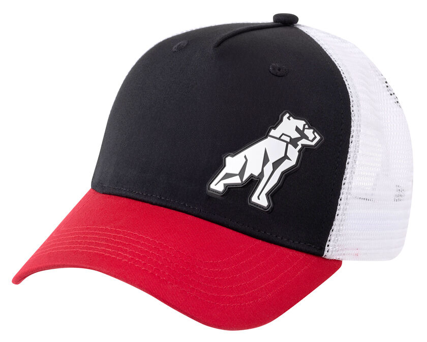 The Mack Tri-Coloured Curved Trucker Cap features a rubber Mack Bulldog logo on the front, a contrasting red brim, and a white mesh back. The perfect combination of shade and ventilation!