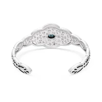 Montana sky with you wherever you go with this stunning cuff bracelet. A bright turquoise stone sits at the top of the silver tone bracelet. The surrounding the stone and continuing around the cuff is an etched design that gives the piece Southwestern flair. Antiquing creates contrast between the bright silver finish and the etched designs, creating a dynamic look. One size fits most. Stone color may vary.