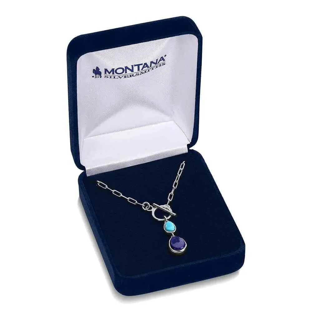 Montana Silversmith's Nature's Obsession Necklace features a turquoise stone, and hanging just below it, a lapis stone - both in organic shapes. This combination creates a unique look that lends itself to any outfit. It's organic, casual and classy. The necklace is a 20 inch paperclip chain with toggle closure for easy wear. Check out the matching earrings here.