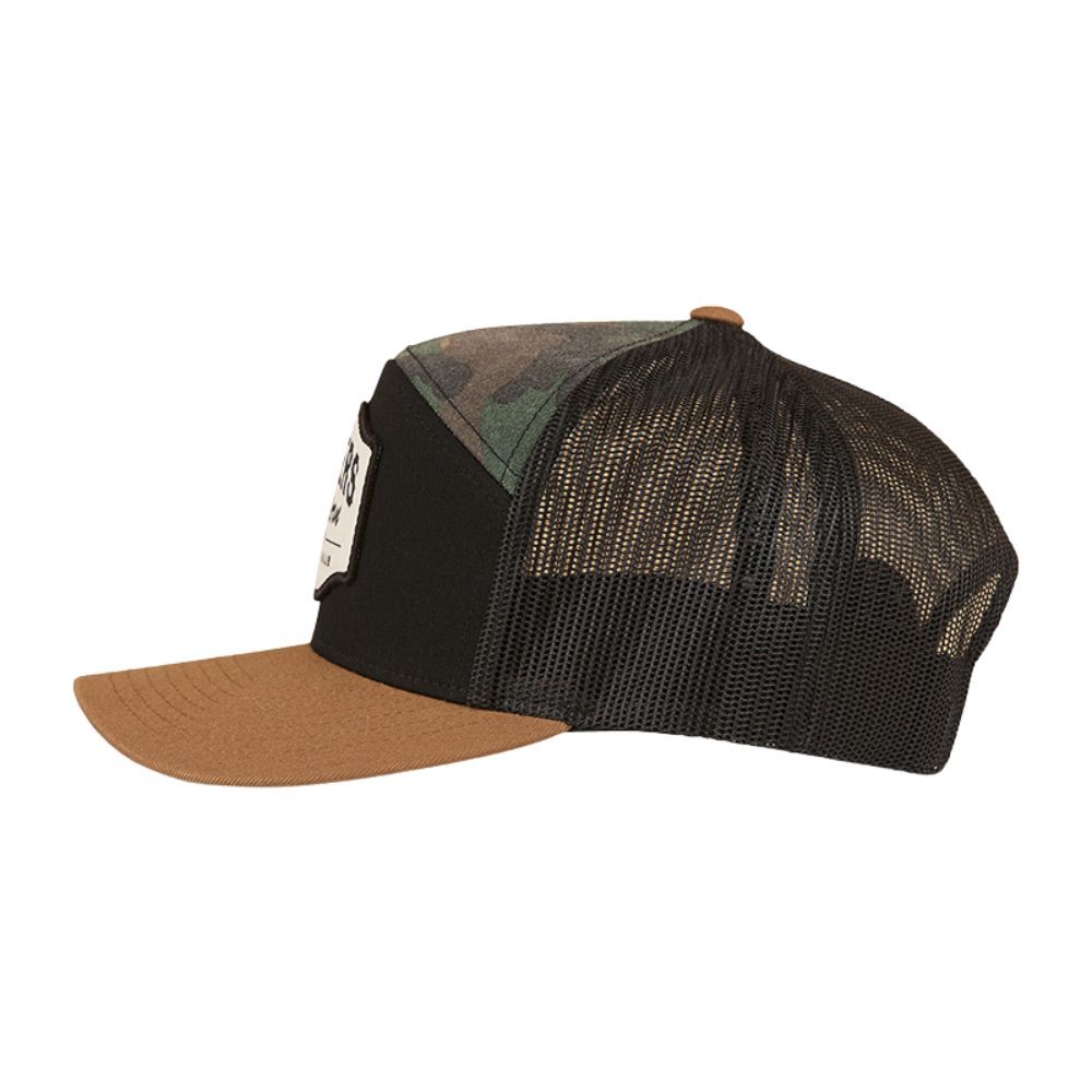 Crafted with style and comfort in mind, this cap has been created from a cotton twill fabric featuring rear mesh panels, providing optimal ventilation and breathability. The stylish 7 panel design is a modern update on the classic trucker, whilst an adjustable snapback allows for a comfortable and customisable fit - suitable for the majority of head sizes. A signature western style woven badge sits up front and centre, beneath a structured camo front panel.