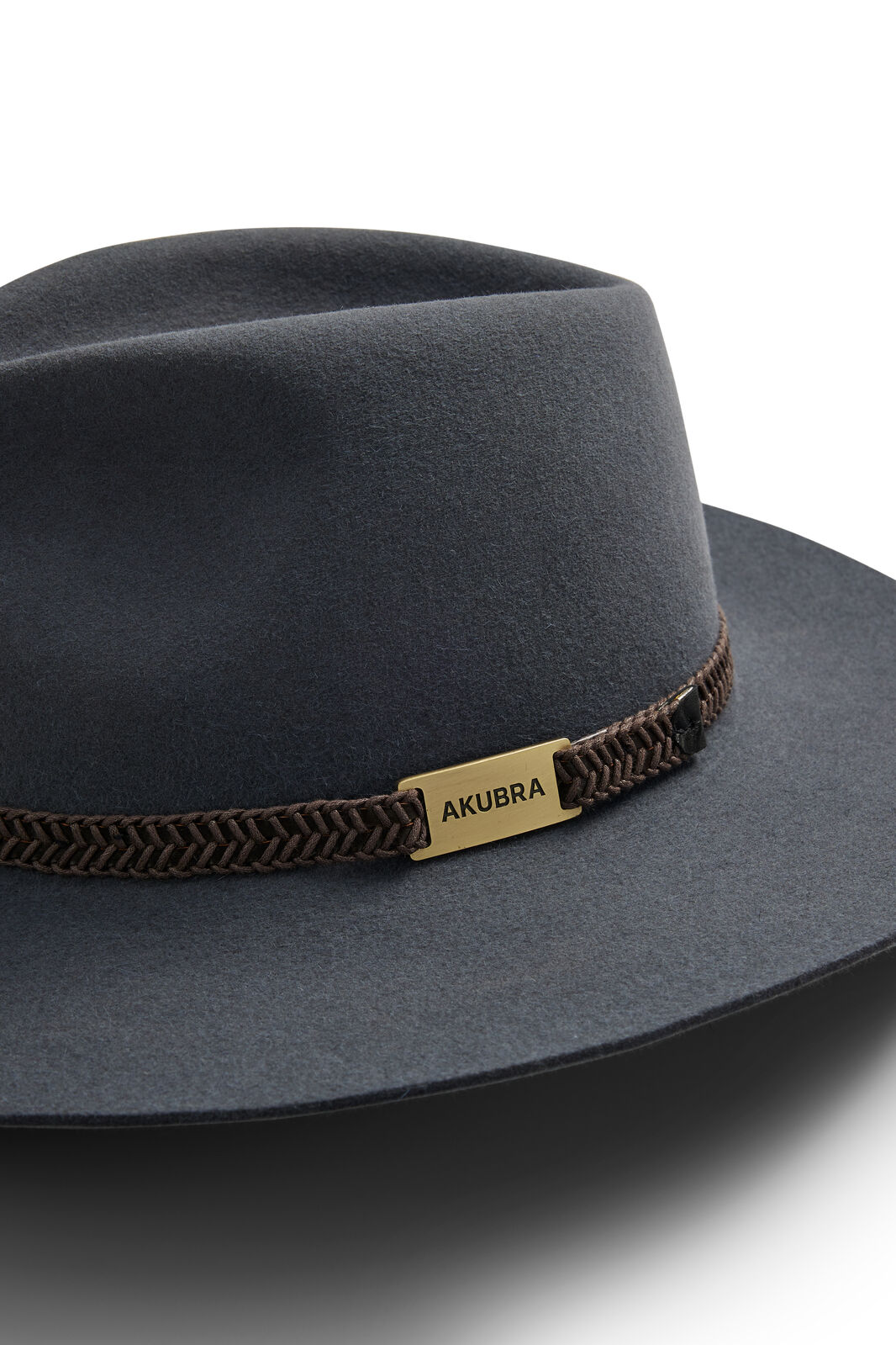 - Plaited bonded leather band with brass Akubra plate