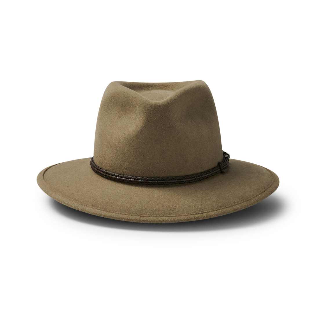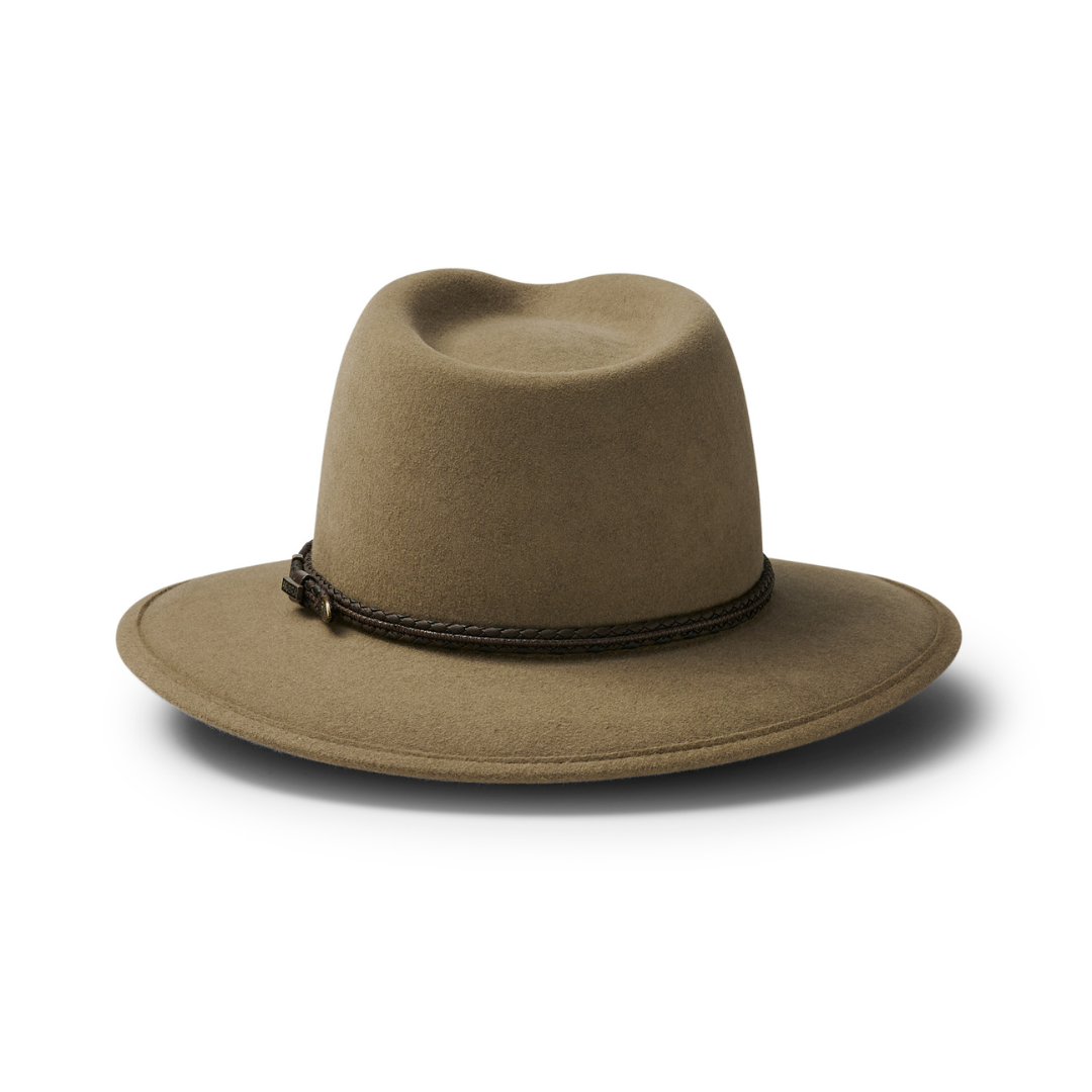 Featuring a soft, conforming structure and a unique 'memory', this soft, pliable felt hat is designed specifically for the adventurer. It can be easily worked back into shape if crushed during your travels. It has a plaited bonded leather band and a soft inner sweatband.