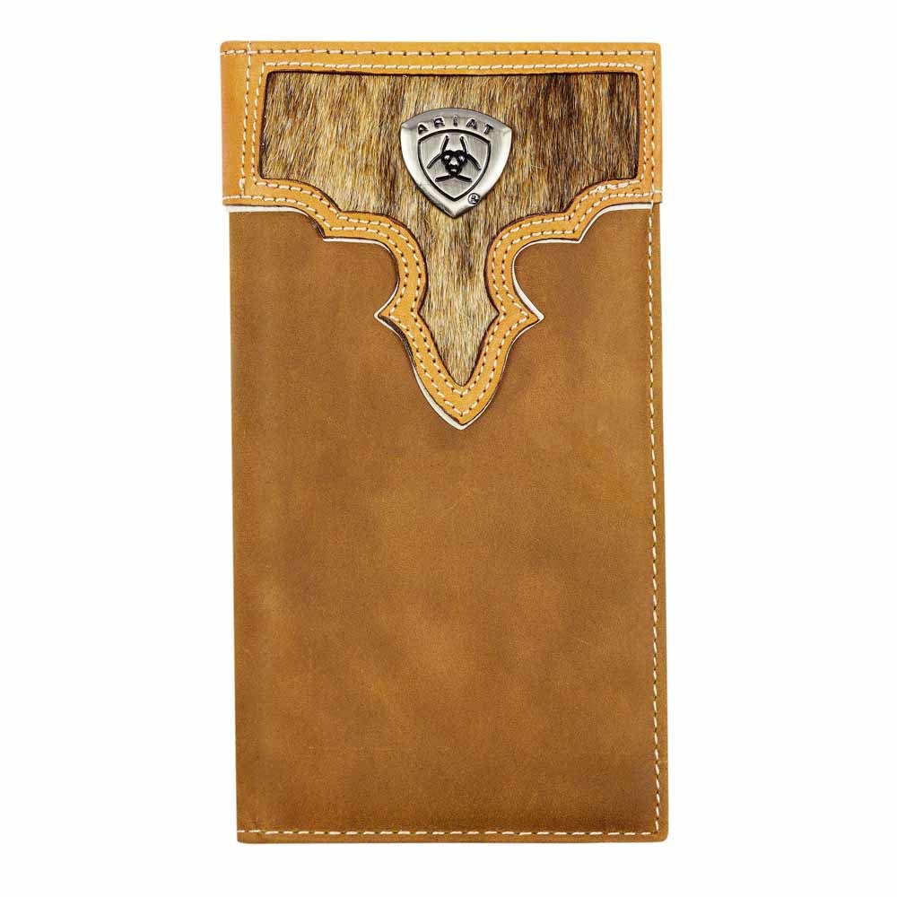 Contrasting premium leathers crafted in layers. Featuring hair-on leather and intricate stitching, and finished off with an Ariat logo feature concho. This is quality, durability and style in a feature wallet that just gets better with age.