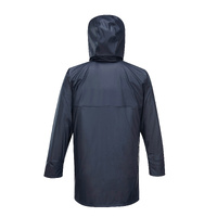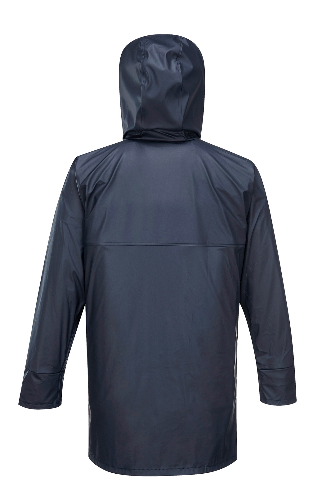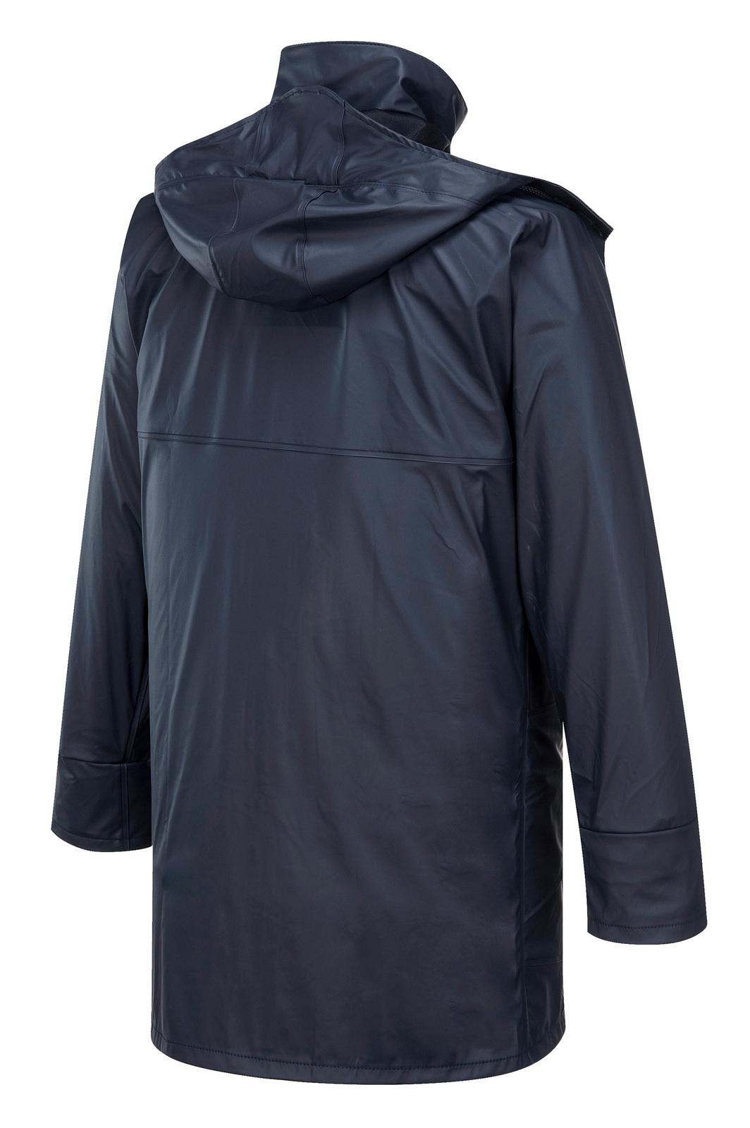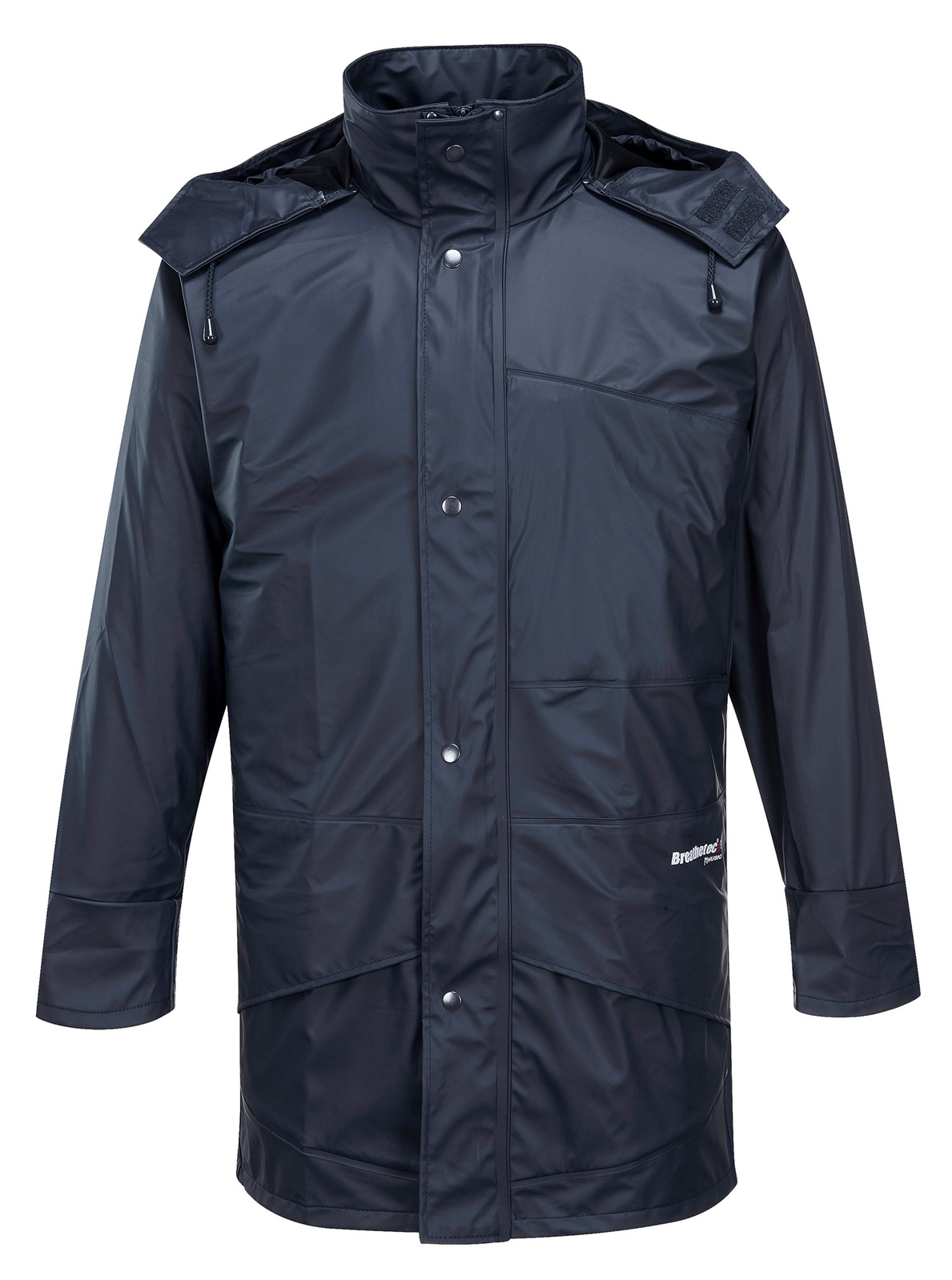 Solid colour long line waterproof/breathable BREATHETEC™ PU jacket with durable knit backing. Technical bonded windproof fabric features 4 way stretch, welded seams. Also features large front pockets, adjustable stowaway hood & storm protection collar.