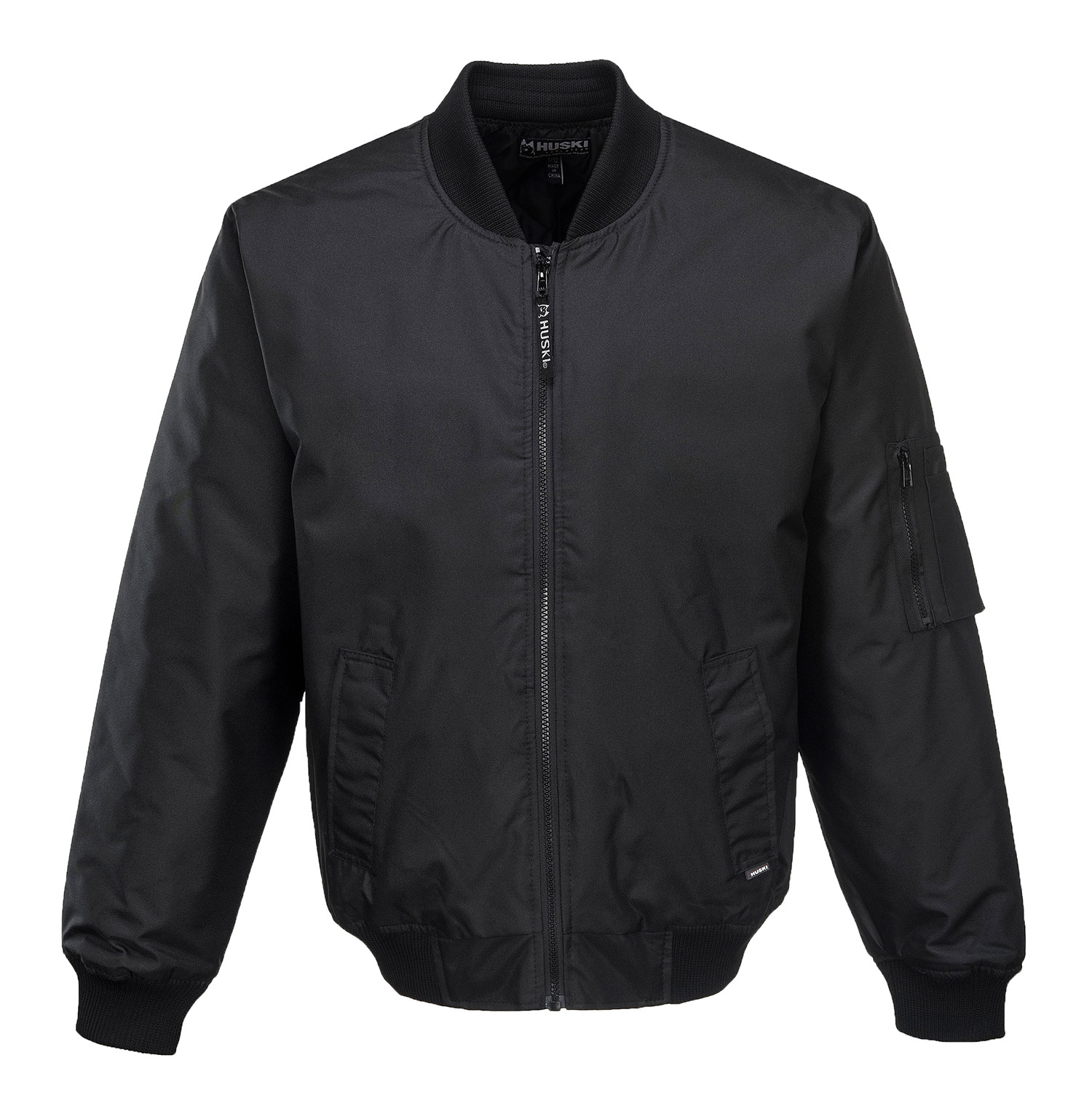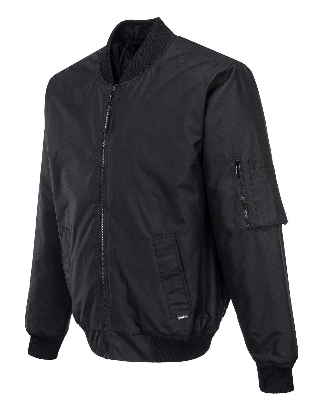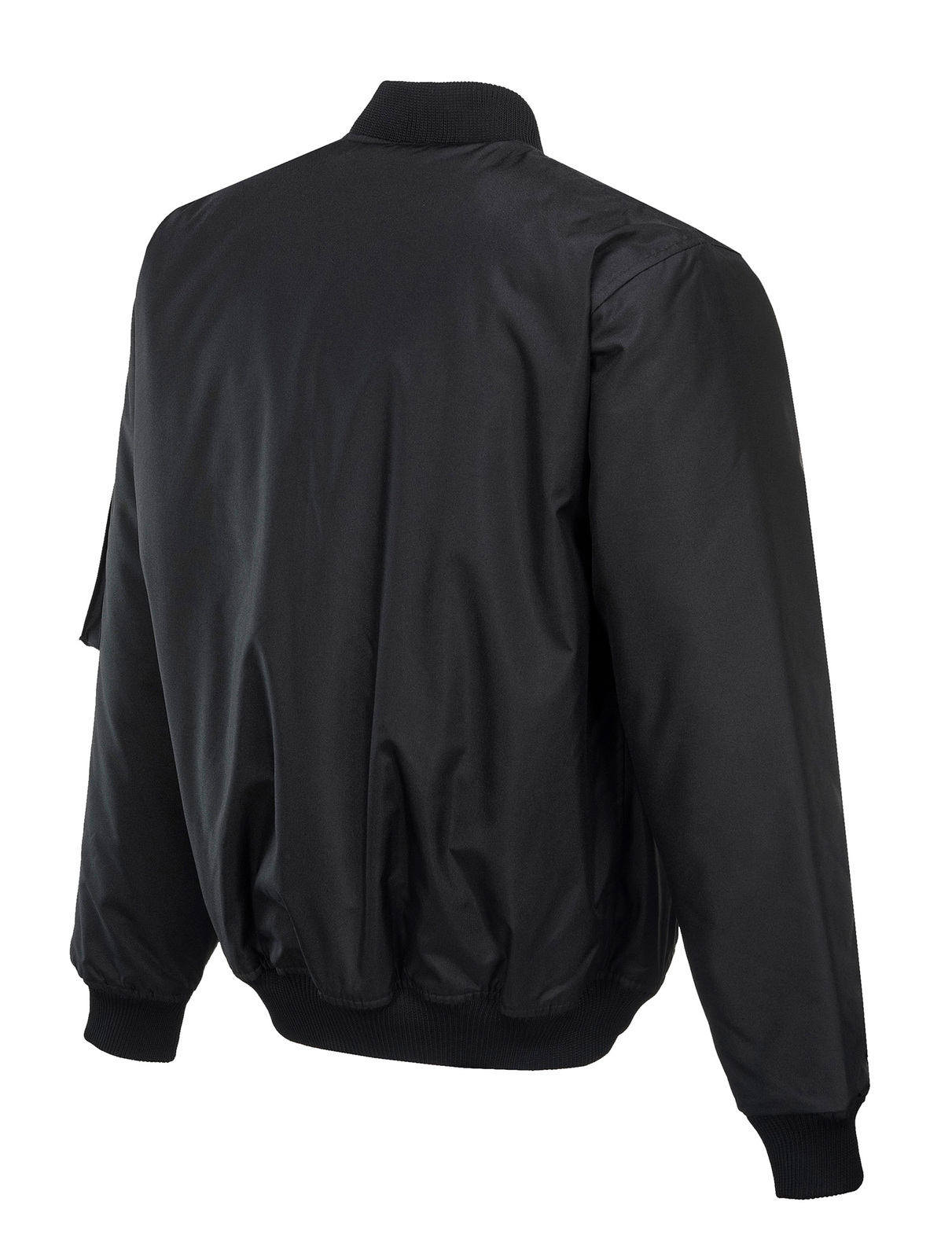 Solid colour bomber jacket, fully lined with quilted lining, features pocket zips, knit collar, cuffs & hem. UPF50+