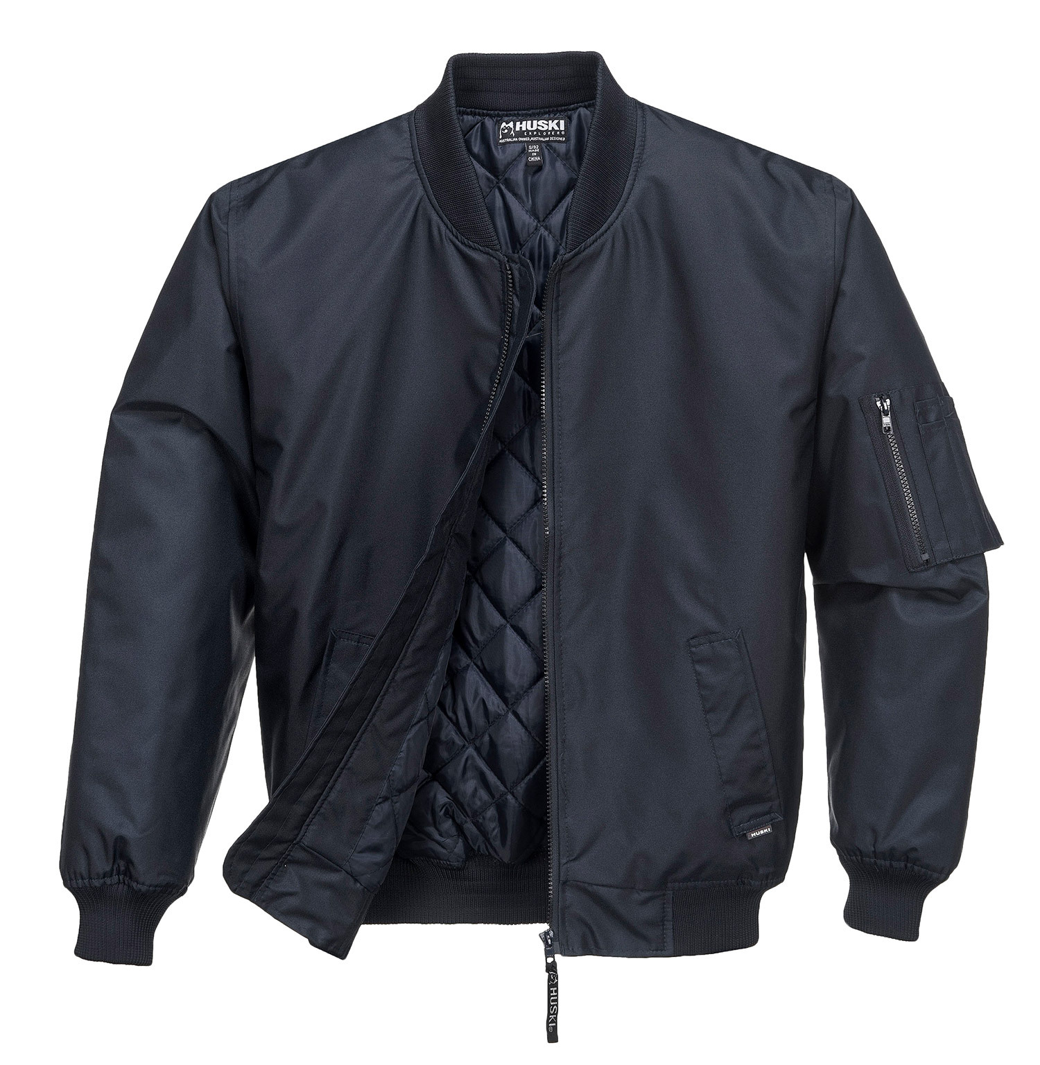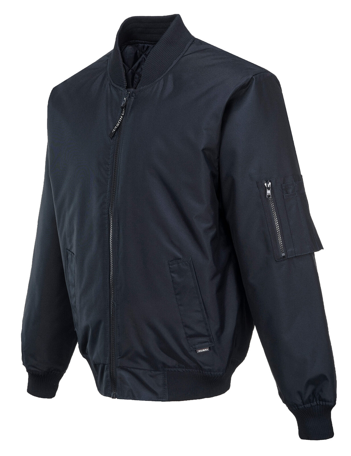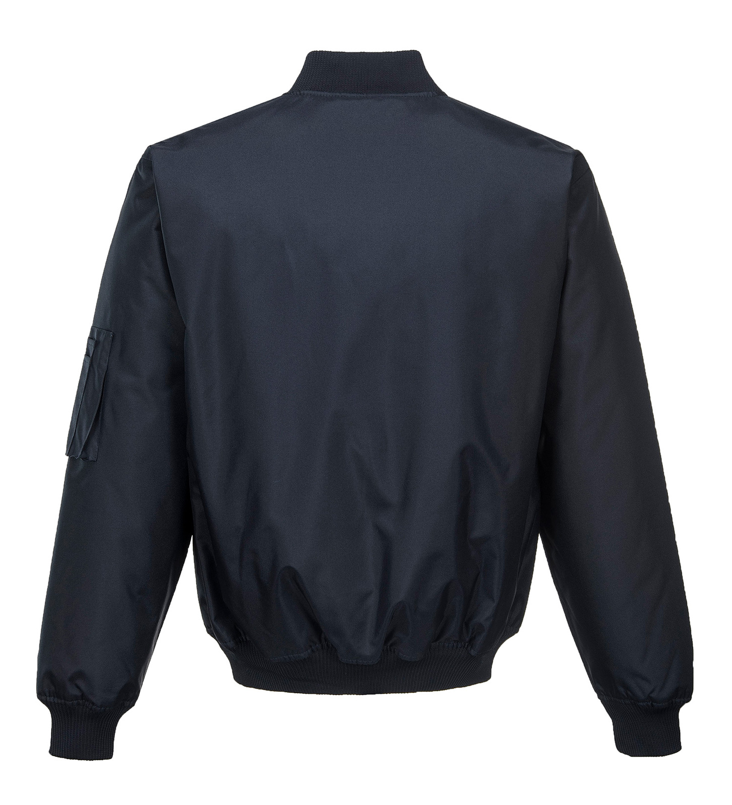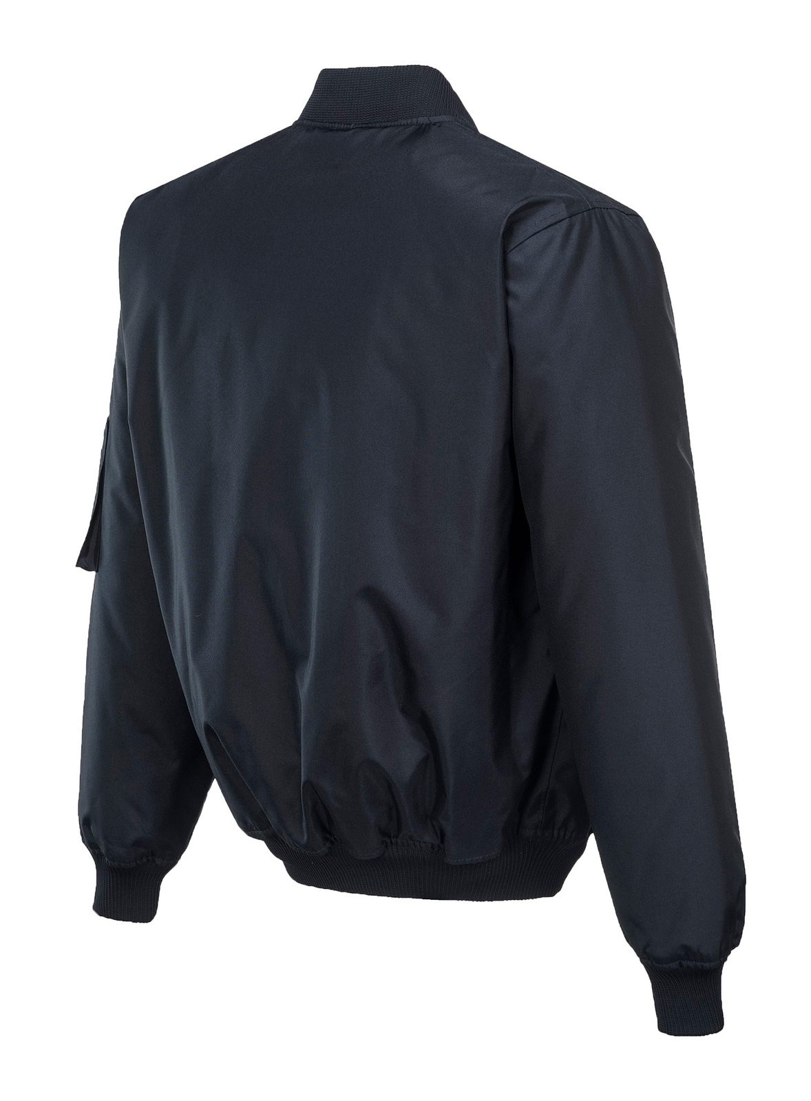 Solid colour bomber jacket, fully lined with quilted lining, features pocket zips, knit collar, cuffs & hem. UPF50+