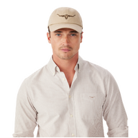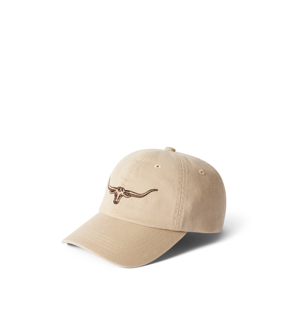 Crafted from 100% organic cotton twill, this cap features an embroidered Longhorn logo and an adjustable strap with a brass branded logo metal clasp.