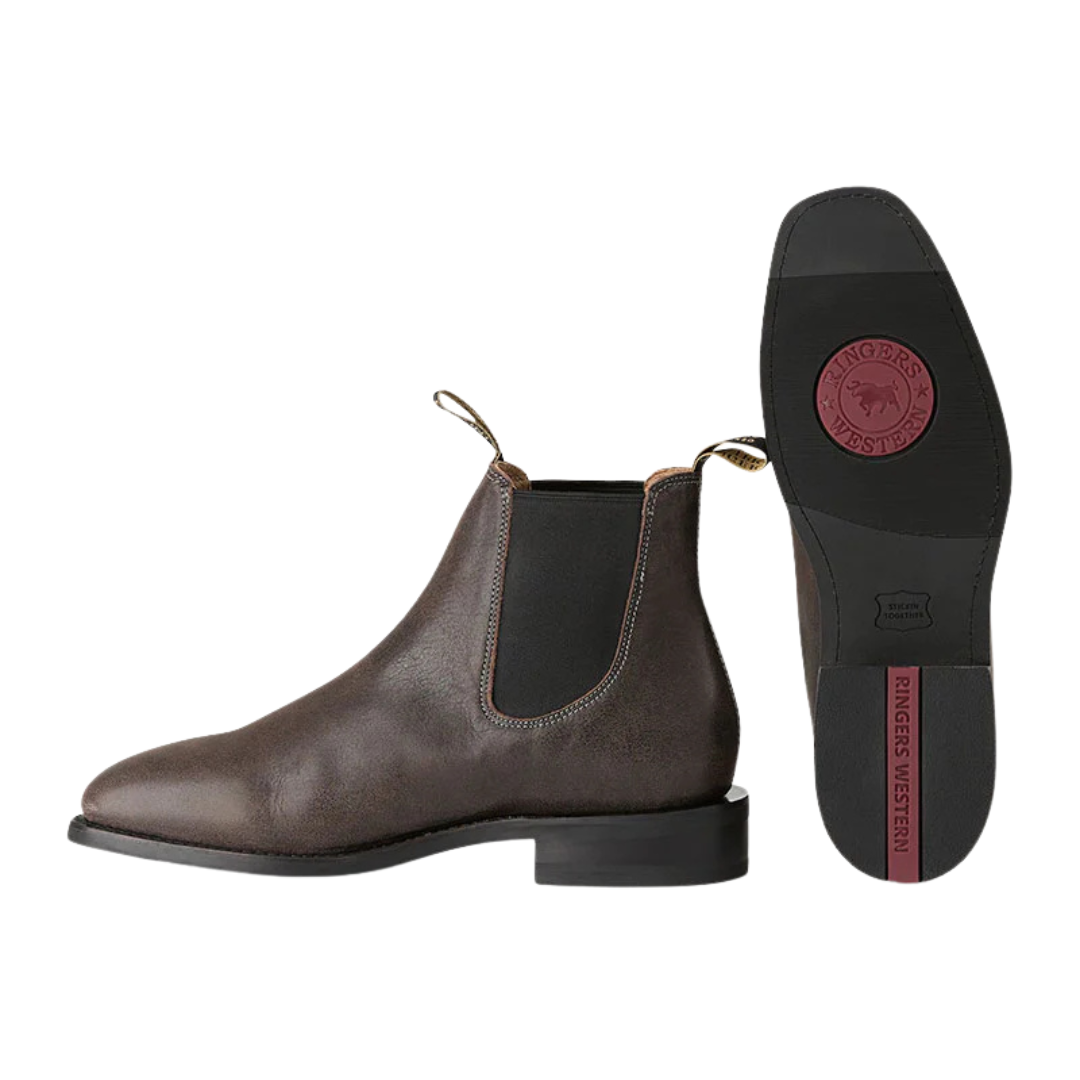 Twin-needled stitching and the signature Ringers Western burgundy logo inset finish the boot with refined detail, paying tribute to the rugged character of the Kimberley — a region built on resilience, craftsmanship, and timeless style. Heritage made, timeless performance, designed for standout style from day to night.