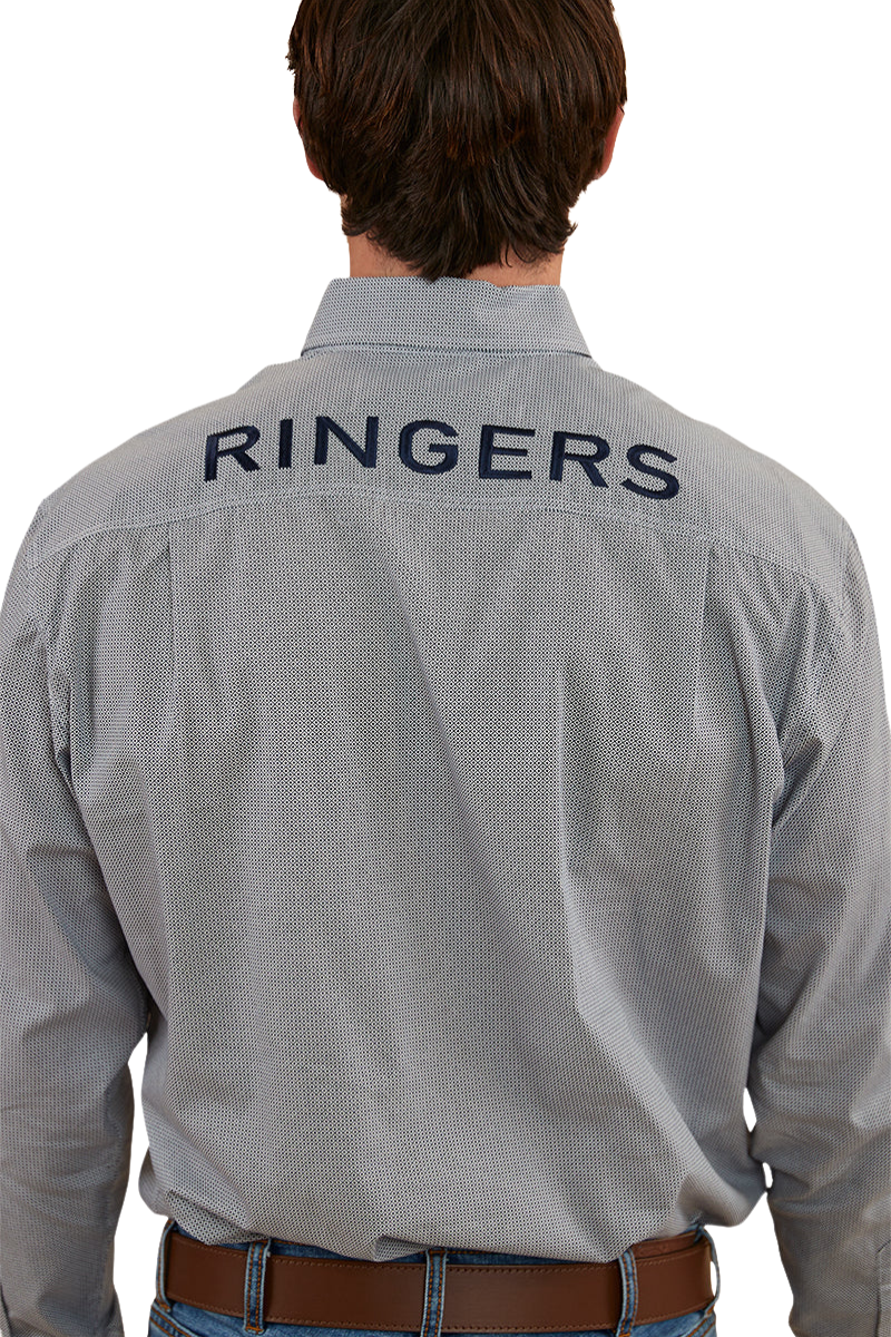 Shelton is the perfect PBR number. This semi-fitting dress shirt is the perfect blend of tradition and modern western wear. The Ringers Western semi-fit dress shirts closely follow the natural shape of your body without feeling too snug or restrictive. Crafted from a premium blend of cotton, nylon, and a hint of spandex, this shirt offers a luxurious feel with a touch of stretch for unmatched comfort and mobility. The Shelton features multiple embroidered logos on the collar, wearers left arm and centre back yoke while the double chest pockets add both style and utility to your outfit. This dress shirt has our 'Cowboy' length which ensures you will never be left untucked - a tried and true staple.