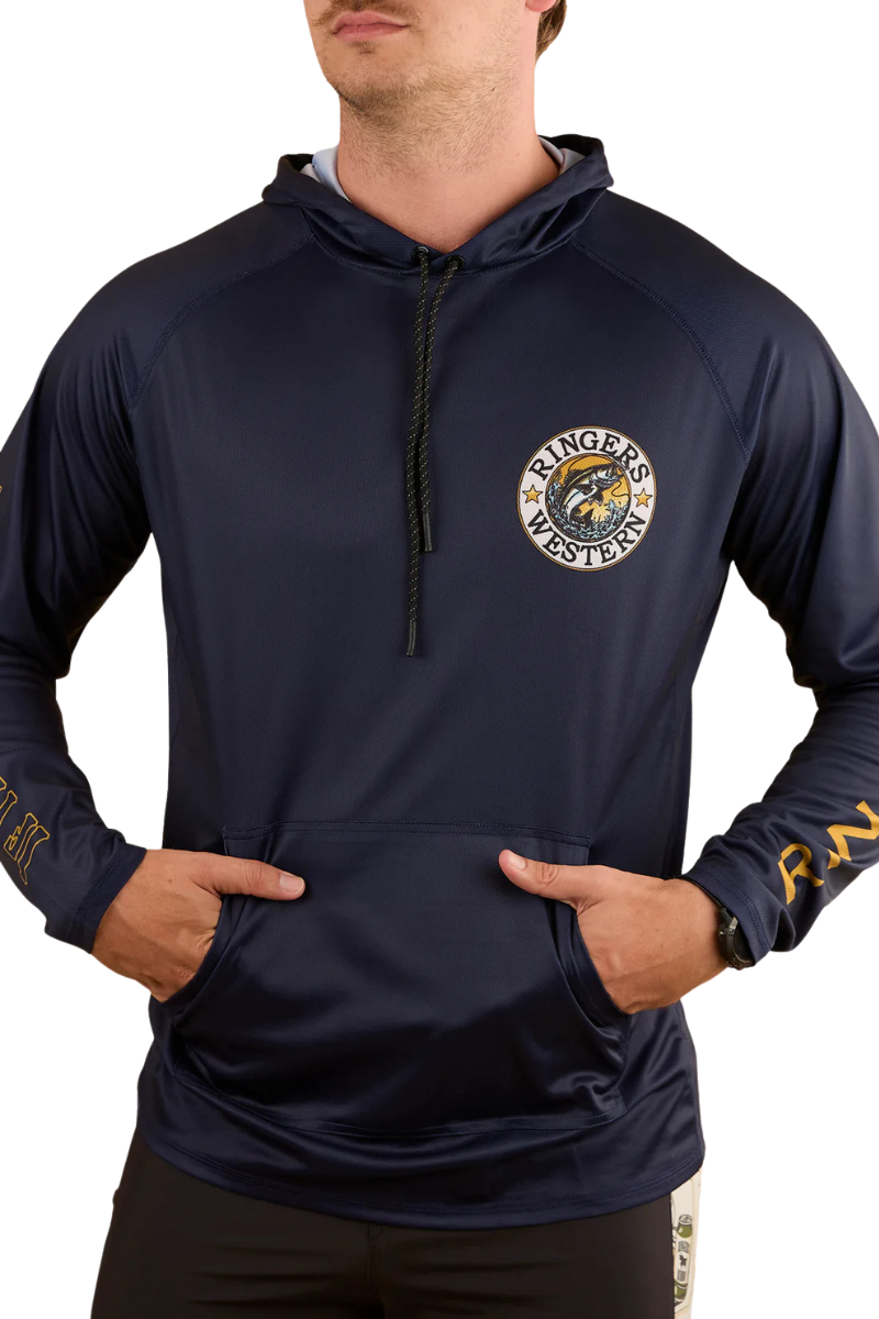 Created for serious fishing sessions, this high performing hooded fishing jersey blends lightweight comfort with next level sun protection. Made from 100% polyester, the Big Catch offers premium moisture wicking capabilities, keeping you cool and dry on your next fishing adventure. The UPF 50+ rating shields you from the harsh rays of the sun, while the adjustable hood feature offers extended coverage of the head and neck - essential for a long day out on the big blue. A handy kangaroo pocket it the perfect place for small essentials, while thumb holders built into the sleeves offer additional protection from the elements. A large signature fishing inspired artwork on the reverse is mirrored by a small chest print ensuring this practical fishing jersey will have you reeling in your next big catch in authentic Ringers Western style.