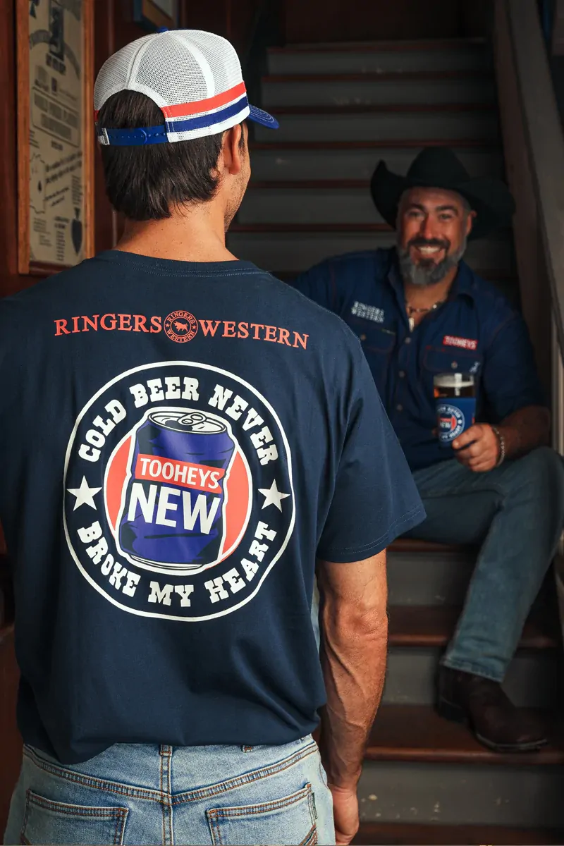 Featuring a timeless crew neck and a soft, breathable handfeel, this graphic T-shirt is made for outdoor adventures, relaxed weekends, and good times with mates. The custom Tooheys X Ringers graphic on the back is paired with subtle Tooheys and Ringers Western logos on the front, creating a bold yet wearable collaboration piece.