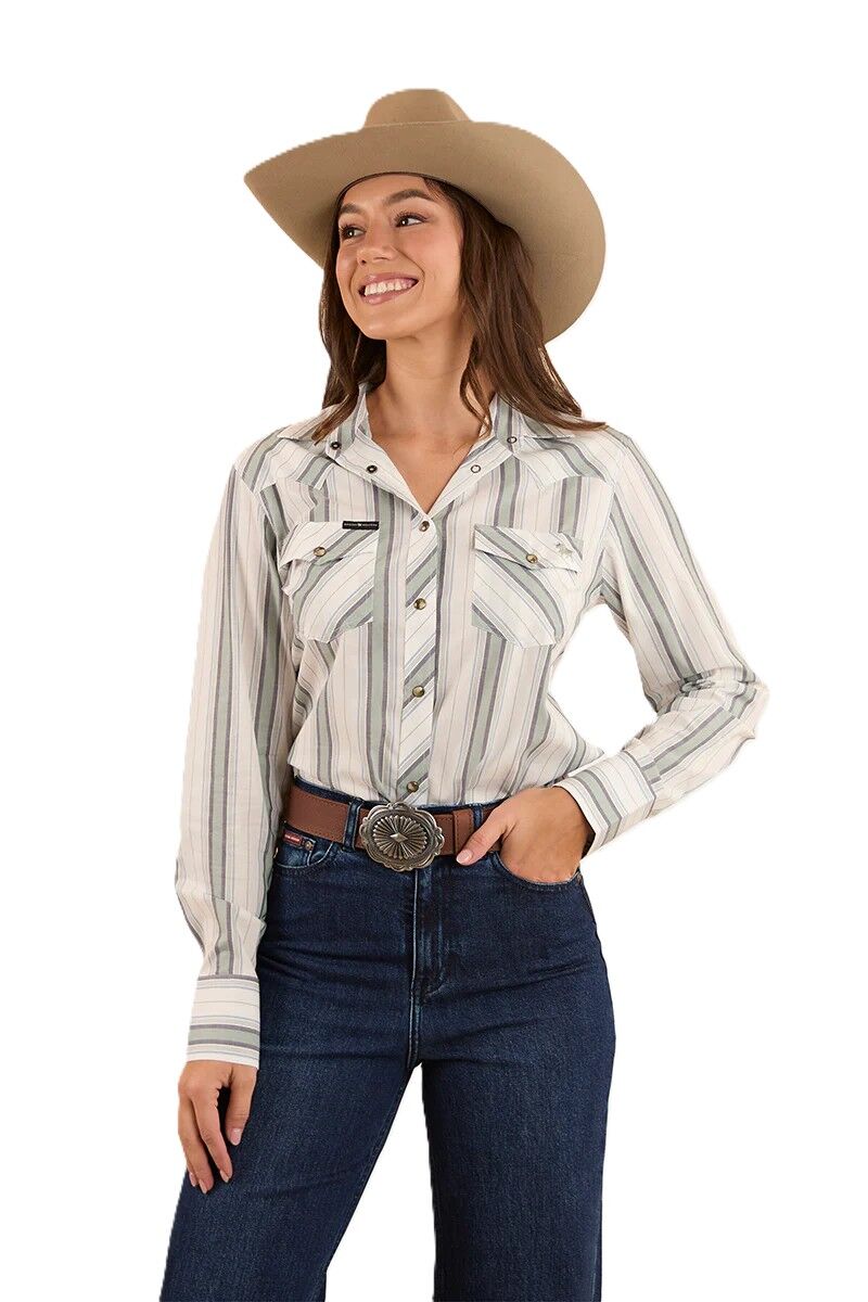 The Bubba Women's Western Shirt is a perfect balance of style and practicality. Crafted from 100% cotton, it’s lightweight, breathable, and effortlessly comfortable. The timeless striped design, pointed collar, and pleated sleeves give it a refined, tailored edge, while marble snap buttons and dual chest pockets add a touch of rugged sophistication.