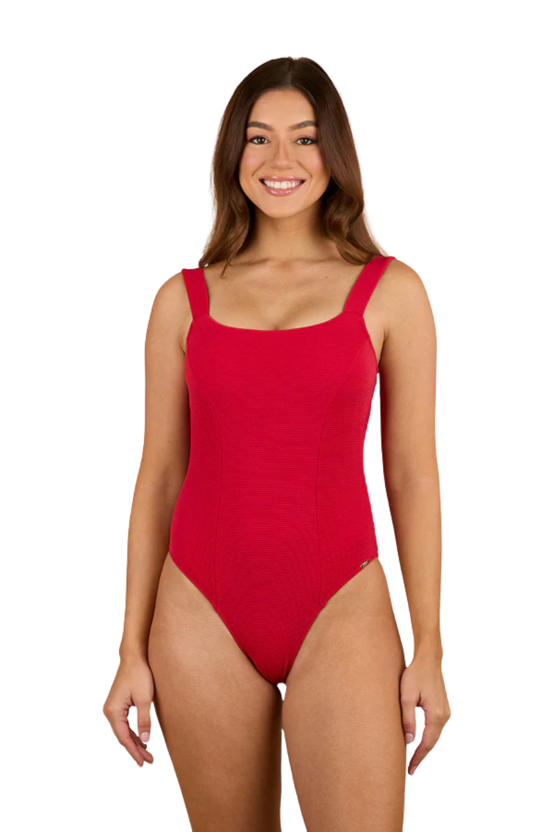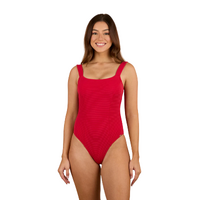 Make waves this summer with the Country Sunset Textured One Piece. Crafted from a bold red textured lycra, this fully lined one piece keeps you comfortable and secure whilst looking effortlessly-chic. An internal shelf bra and functional back clasp provide additional support, perfect for active days spent enjoying the surf - whilst removable padding gives the option for additional coverage and contour. An elegant square neckline is perfectly balanced by a low cut back, while the Hi-cut design creates the illusion of added height by elongating the legs. The cheeky fit bottom adds a splash of playfulness to this charming and versatile one piece that is sure to turn heads this summer.