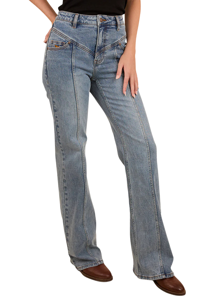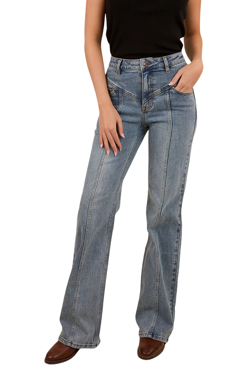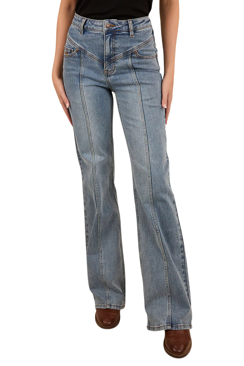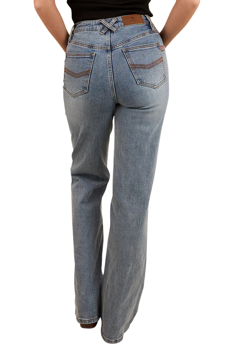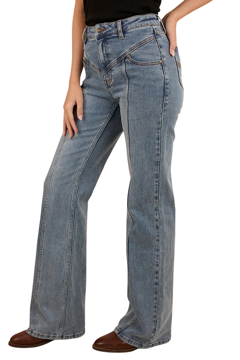 These high rise denim jeans offer superior comfort and breathability, moving with your body whilst providing structure and maintaining shape. The bootleg design elongates the legs, fitting through the hips and seat before gently tapering off at the knees - making the Edith’s perfect to pair with your favourite boots for a stylish and flattering ensemble that will take you anywhere. The V-front yoke panel and front leg seams are standout features that perfectly capture true western style. Cross over belt loops feature on the back of the waist band adding some fun yet functional western flair, whilst signature back pocket stitching and woven labels complete the look with Ringers Western authenticity.