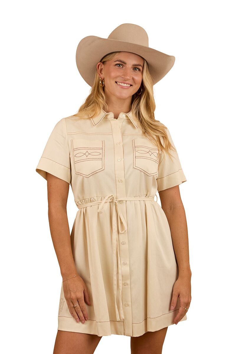 Created from a Cotton Tencel blend, the Eloise is buttery soft against the skin whilst providing superior breathability. The Tencel component of this fabric offers a beautiful drape as well as boasting wrinkle resistant capabilities, making the Eloise a perfect travel companion. A full front button placket is stylish and functional, enabling this versatile shirt dress to be styled to your own personal preference. Dual front chest pockets are functional and stylistic details, elevated with contrasting western style embroideries which are accompanied by complementary embroideries throughout. The waist tie perfectly nips in at the smallest part of the waist creating shape and flattering the female form.