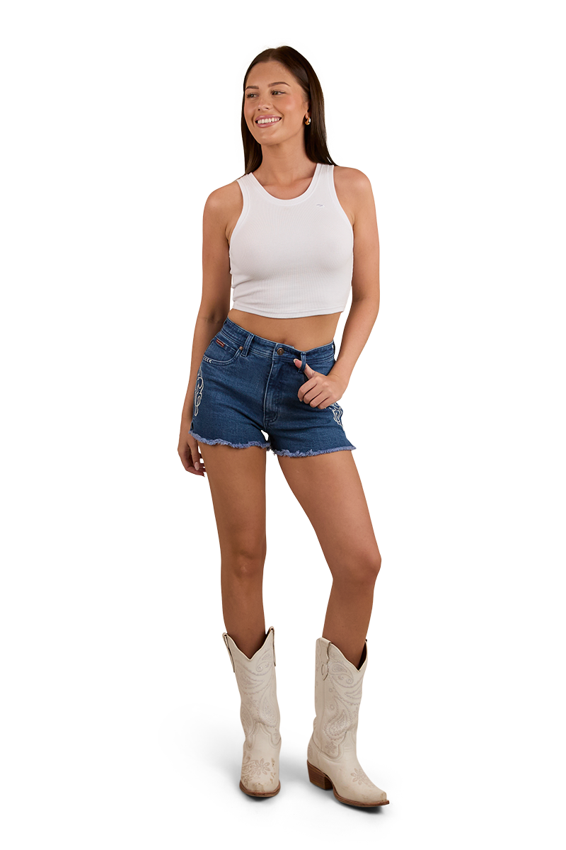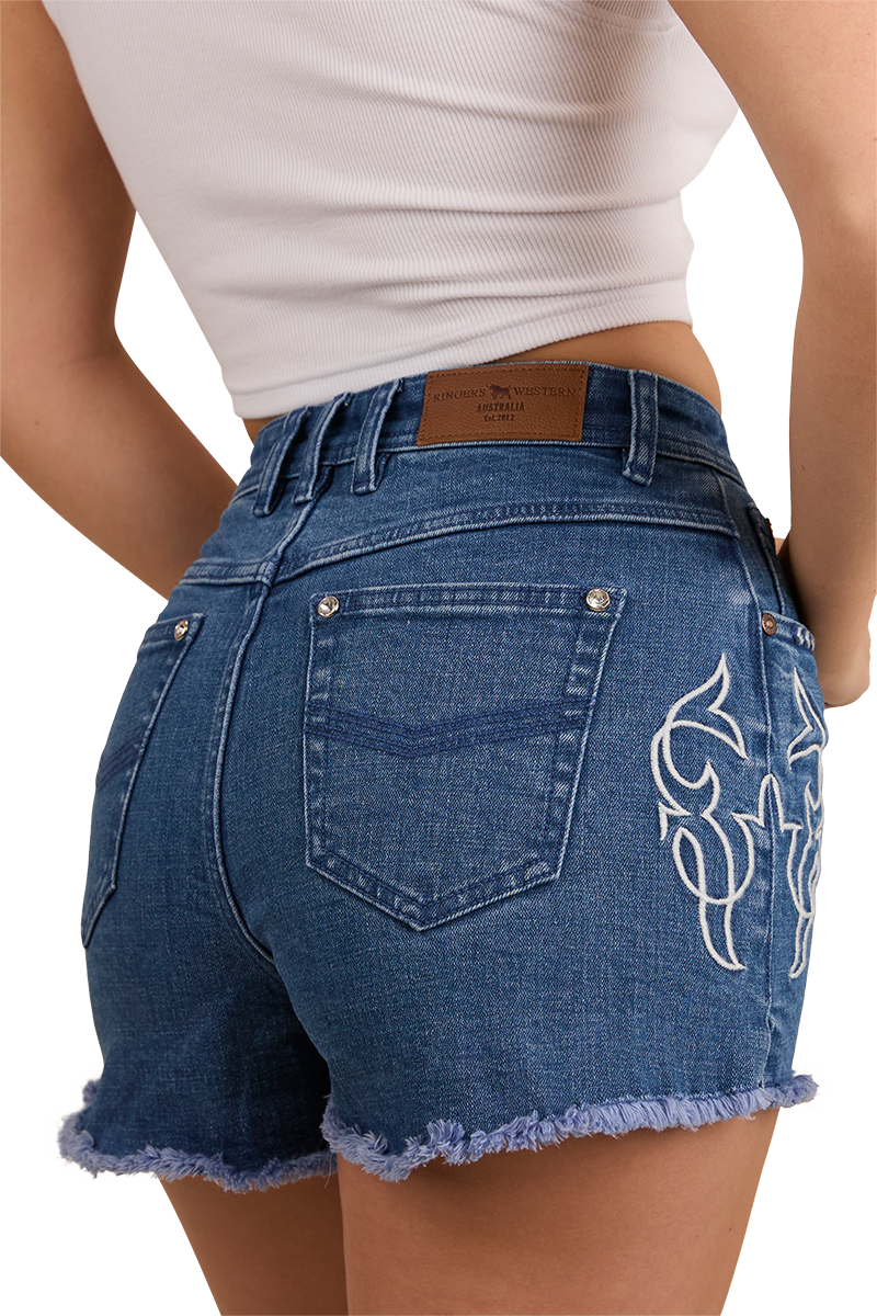 Nothing screams country music festival like a pair of denim shorts. The Gracie denim shorts are a Summer essential; they are a true statement of elegance and Western flair. The Gracie short is made from a cotton stretch blend providing durability and breathability for a nice and comfortable fit all day long. These shorts have the Ringers Western high-rise fit which is designed to rest comfortably above the belly button and neatly come in through the hip and seat for a slightly formed fit. Gracie features a traditional five-pocket design and seven belt loops which fits any standard-width belt. This range features a feature embroidery design on the back pockets and a raw hem for added rustic allure.