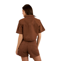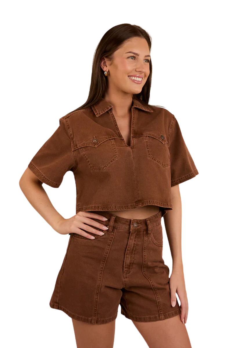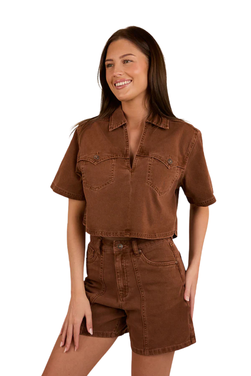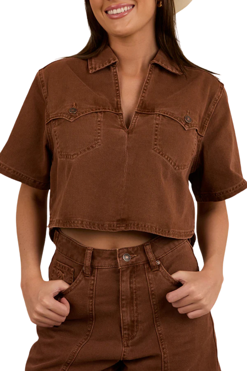 The Iris Women's Denim Top has been created from a rigid denim, boasting the breathable properties that cotton is known and loved for whilst maintaining structure. The relaxed style features a semi cropped fit, creating an effortlessly stylish silhouette that can be paired with both high and low waisted styles. A rustic washed saddle brown hue is complemented by functional western style yoke pockets, adding a traditional and rustic feel. A deep V front elongates the neck, bringing a flattering and feminine touch to this fashion forward style.