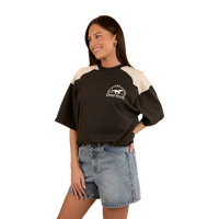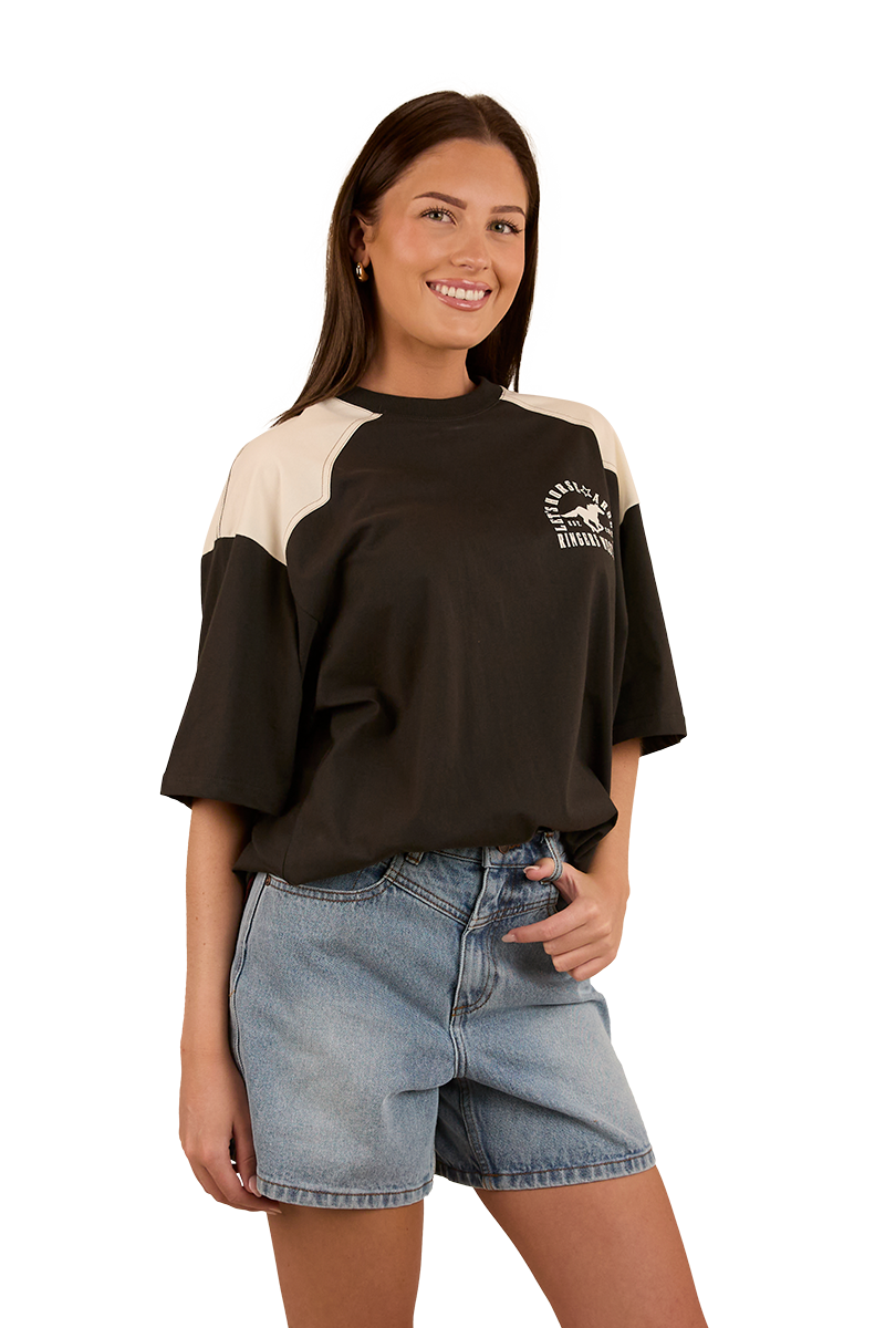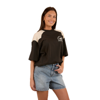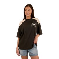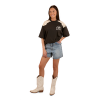 Created from a cotton jersey blend, this oversize tee is the ultimate fusion of comfort, breathability and style. The oversized fit gives this tee a modern edge and multiple styling options, pair with your favourite denim or activewear for a fashion forward cowgirl ensemble. Contrasting western style yoke panels and a signature horse themed graphic add some lively country charm to this versatile wardrobe staple.