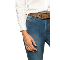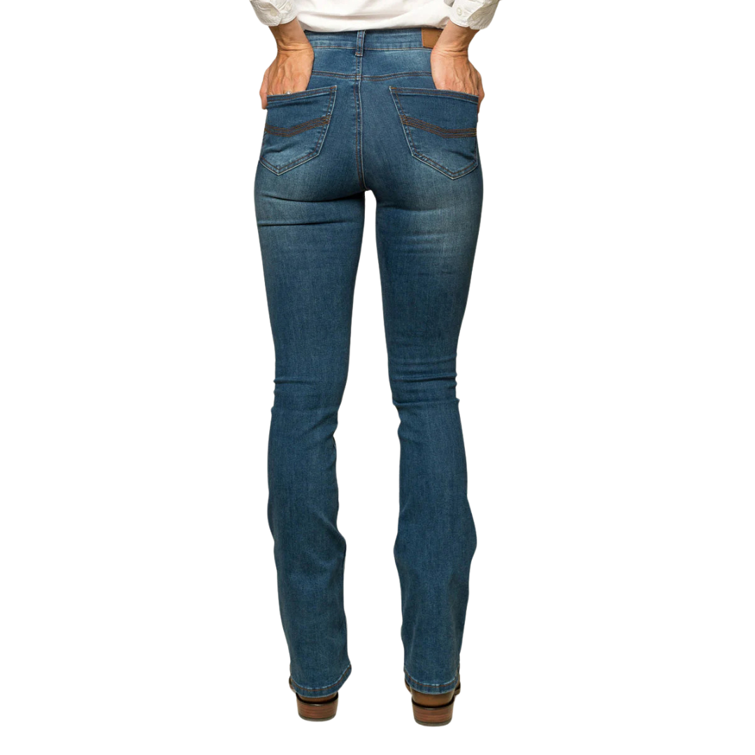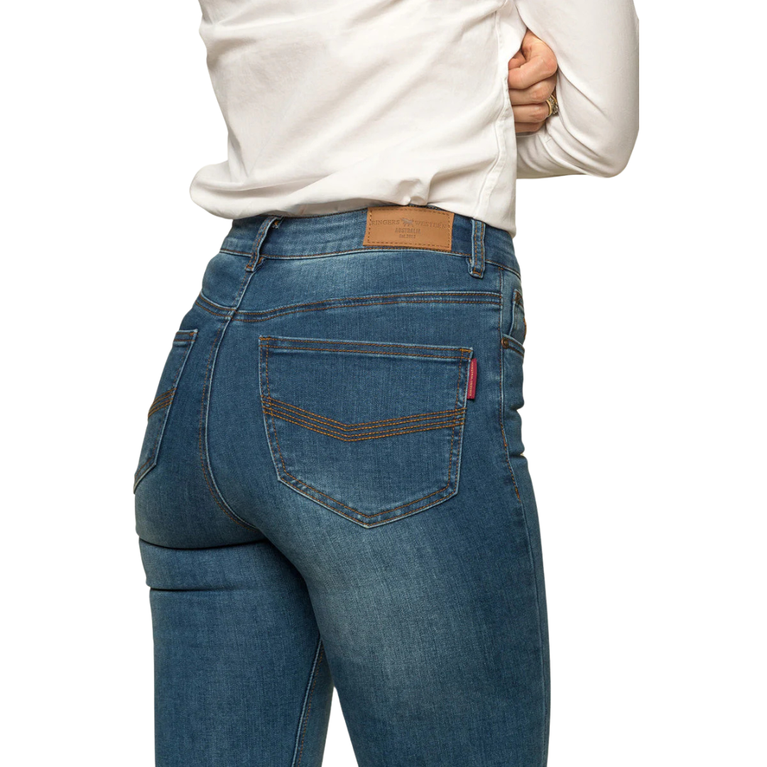 Penny is Ringers' high-rise favourite and she’s about to be yours! The Ringers Western high-rise jeans are designed to rest comfortably above the belly button with a snug fit from the waist through to the hips and thighs, contouring the natural curves of a woman's body. Hugging the thighs and making its way down to the knee where the bootleg shape begins to slightly flare out, creating the signature bootleg shape. Made from a cotton blend, this material provides durability and breathability with a dash of elastane ensuring the jeans have a slight stretch for a more comfortable fit. The elastane segment is quite minimal which helps to maintain the traditional stiff feel of western denim. Featuring a traditional five-pocket design, a small Ringers Western bull embroidery on the coin pocket and a centre front zip closure for easy wearing. These high-rise favourites are the perfect riding jean because of their higher waist, no shirt will be left untucked from this little number.