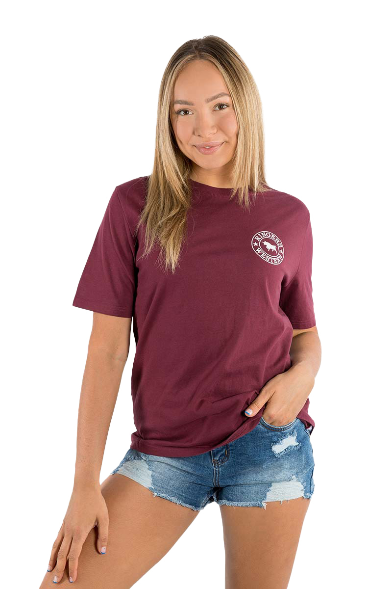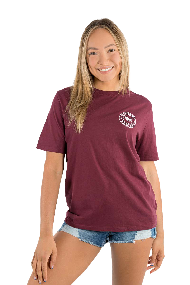 Ringers Western Womens Signature Bull Loose Fit S/S Tee (220018RW) Burgundy/White Print 8
