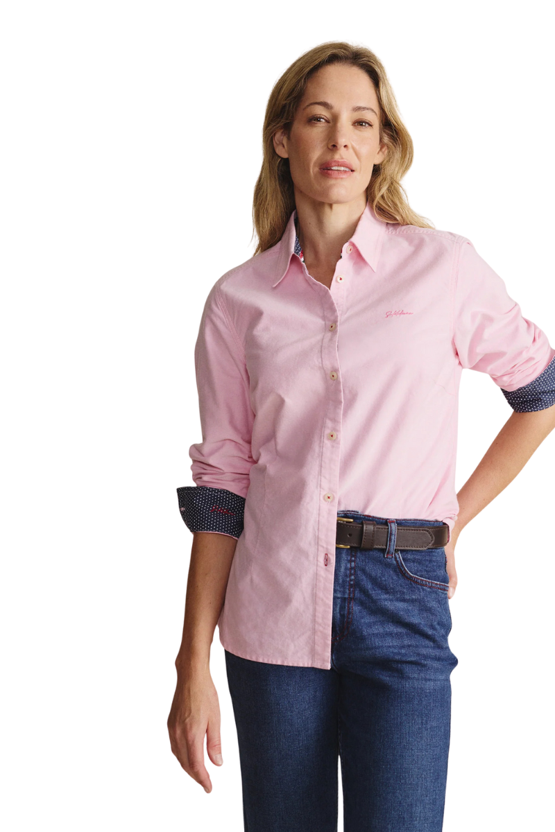 Crafted from 100% Oxford cotton and featuring a classic tailored fit, the Lennard shirt is a wardrobe essential. The collar stand, cuffs, and front placket are lined with our exclusive micro polka dot poplin, while signature S.Kidman red detailing adds a touch of distinction. Tuck it in for a polished office look or untucked for that effortlessly smart, yet casual feel.