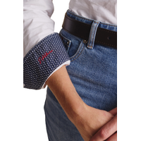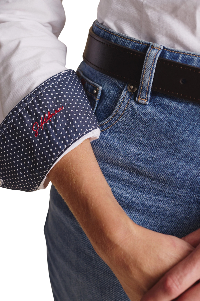 ✔ Inside collar stand, cuffs, and front placket lined with 100% cotton polka dot poplin