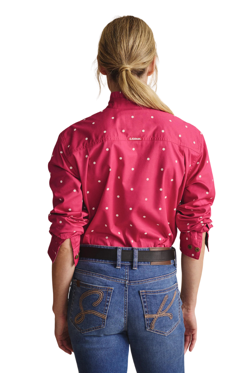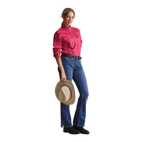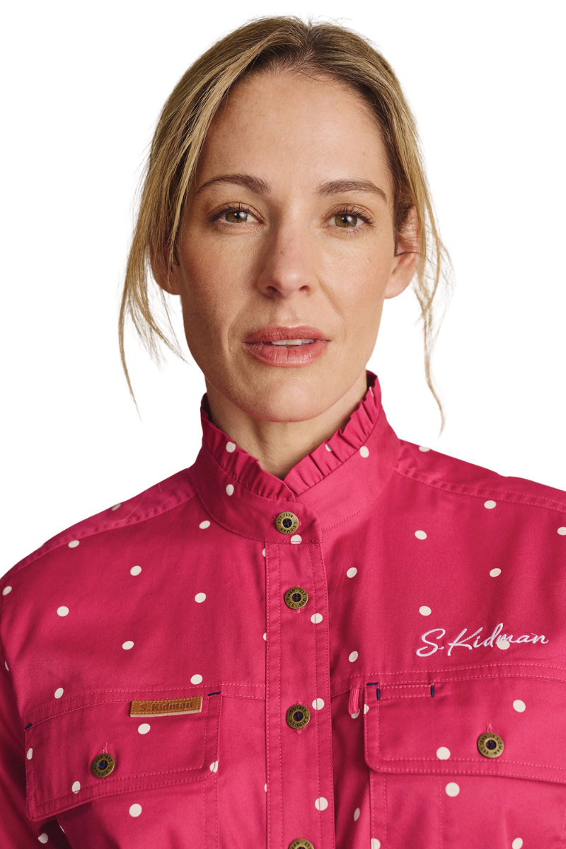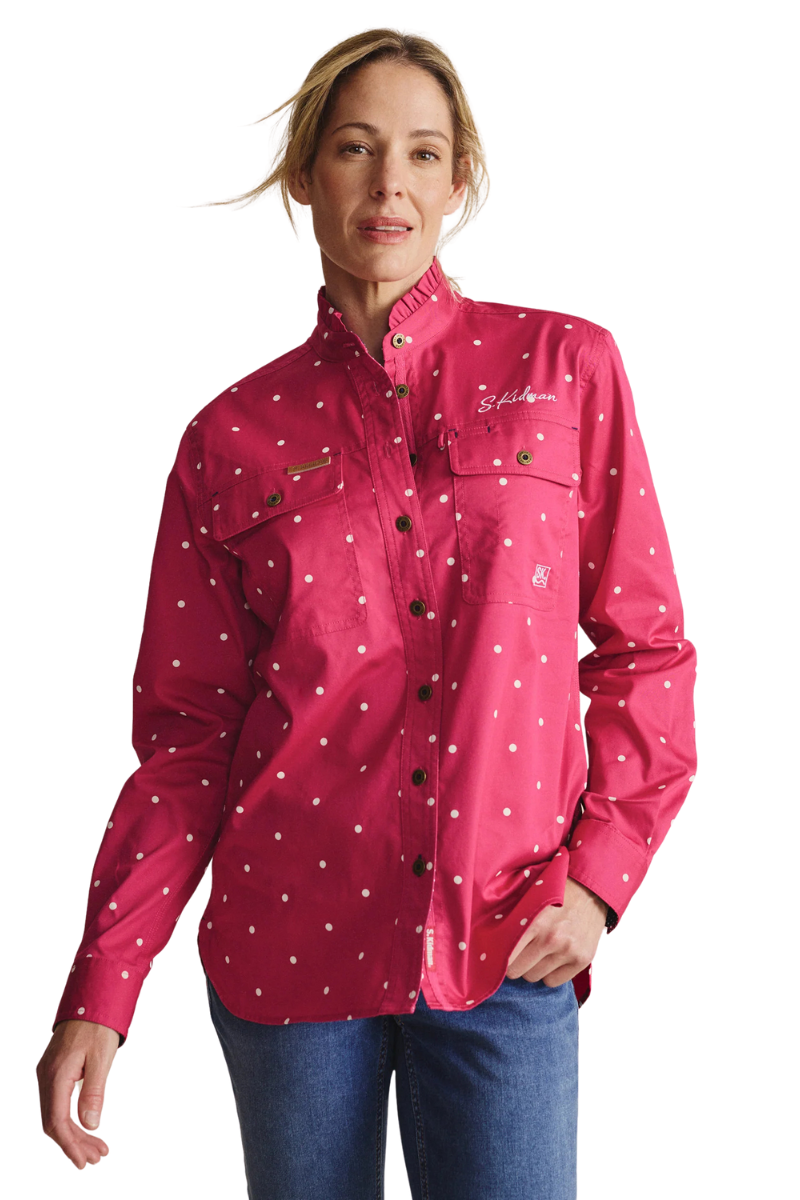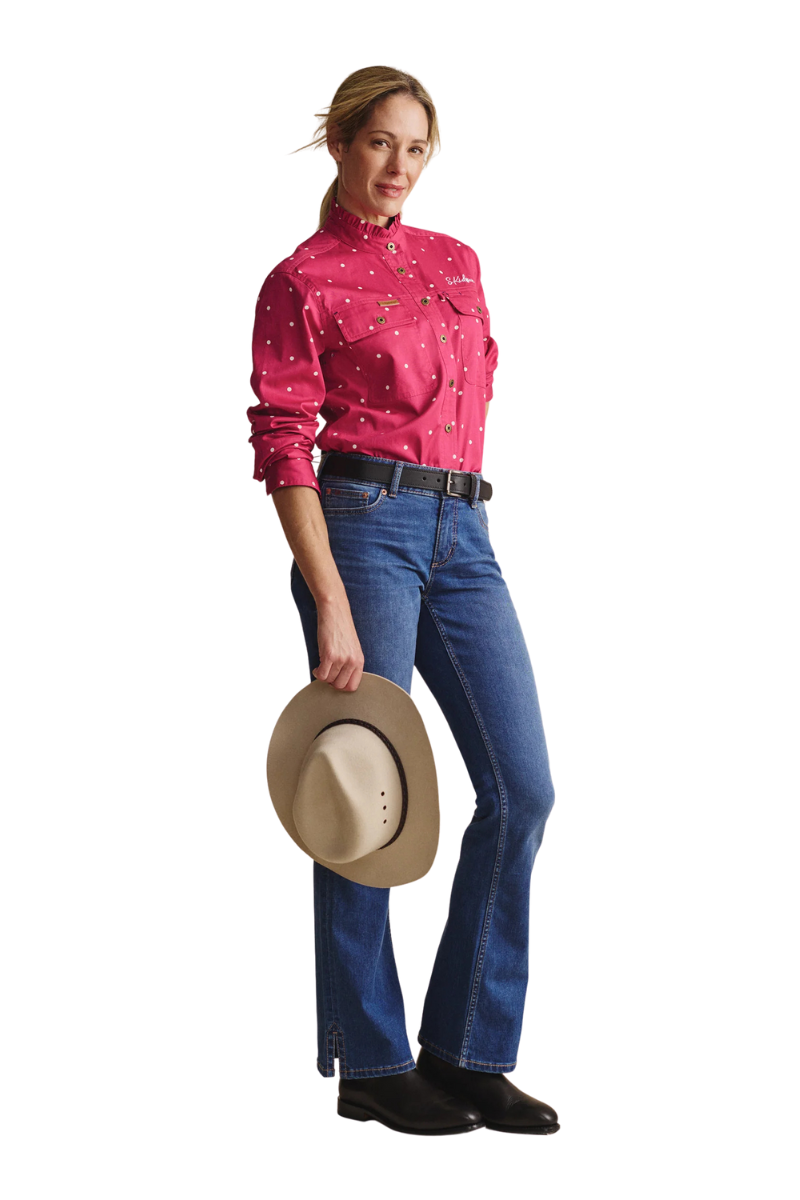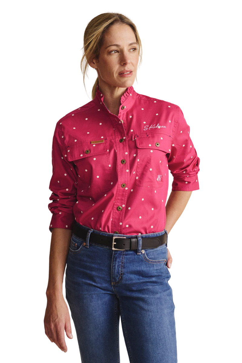 For ladies of the land who work on the land their way. The Lilly Pilly full placket work shirt brings a touch of uniqueness with its frilled collar detailing. Crafted from 100% lightweight cotton, it has plenty going for it. Reinforced double-stitched seams, large pockets, underarm ventilation eyelets, heavy-duty buttons and our signature S.Kidman finish come together to make a statement in toughness with a touch of flair.