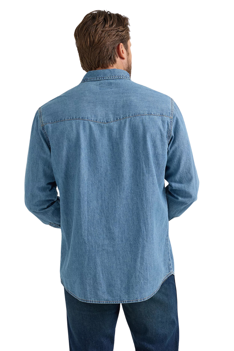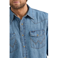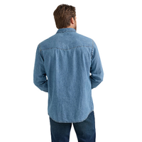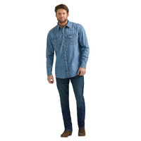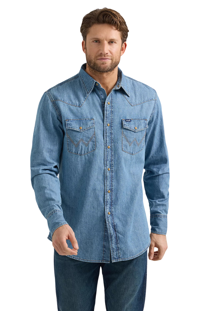 When you need to layer up, the Men's Wrangler® Classic Denim Western Snap Shirt has you covered. It’s crafted from cotton for comfort and lasting quality. And the classic fit will seem as if it was made just for you. This long-sleeve collared shirt comes with all the heritage-inspired details you know and love—one point front and back yokes, snap flap chest pockets with the ‘W’ stitching, a snap closure, and a classic fit that’s easy to dress up or down.