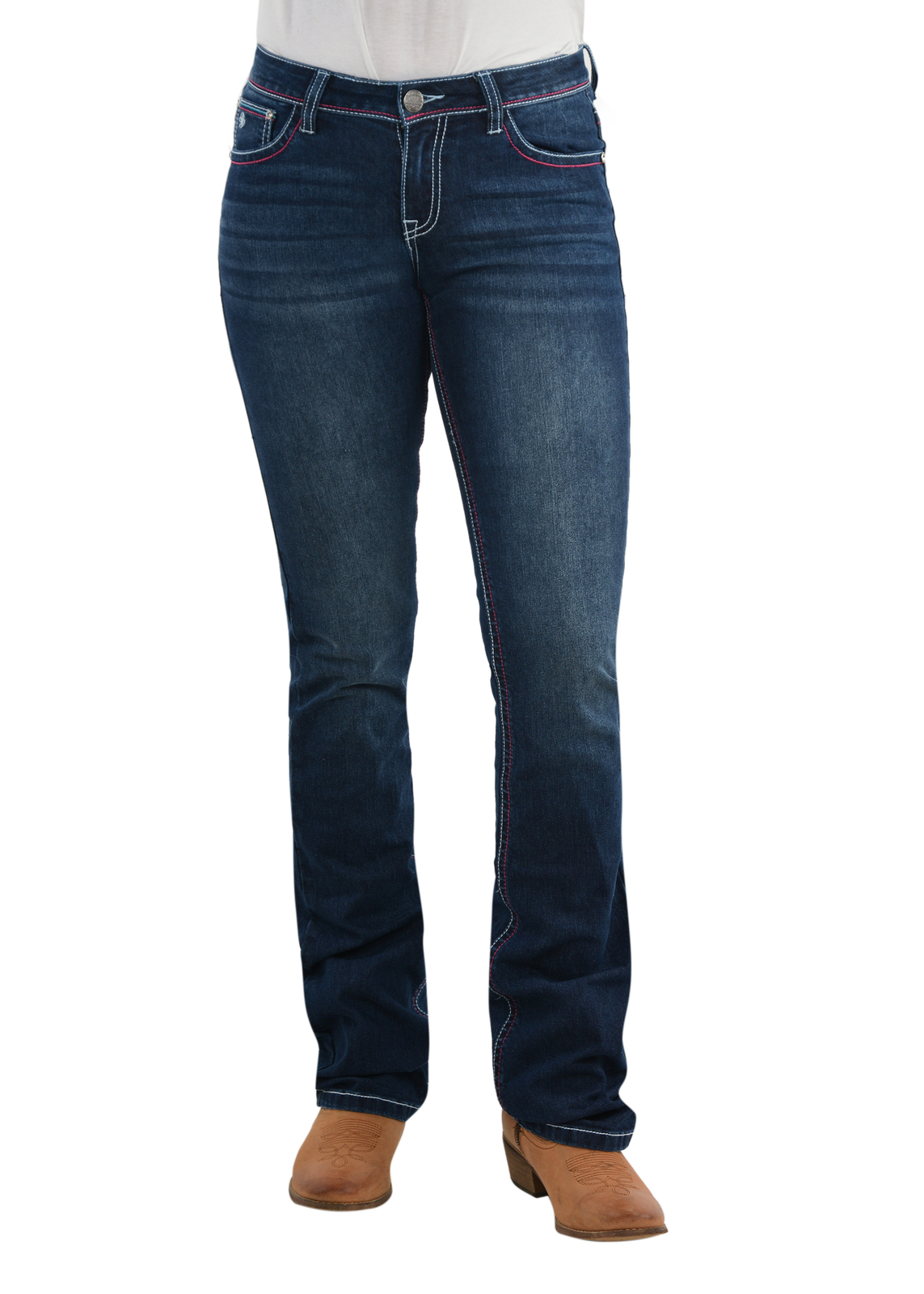 Pure Western Womens Jules Relaxed Rider Jeans feature geometric contrasting stitching in pink and turquoise.