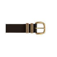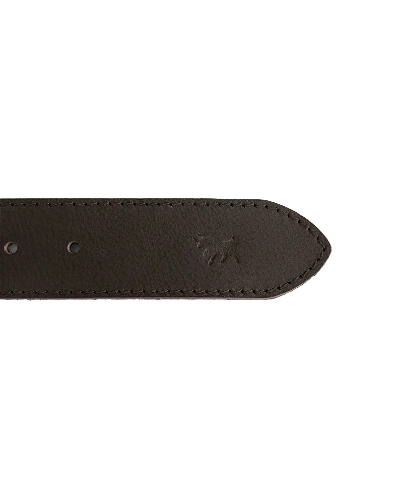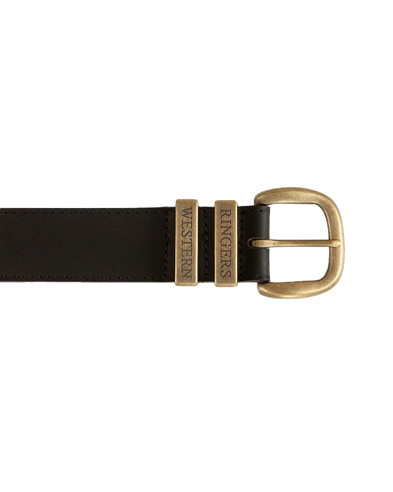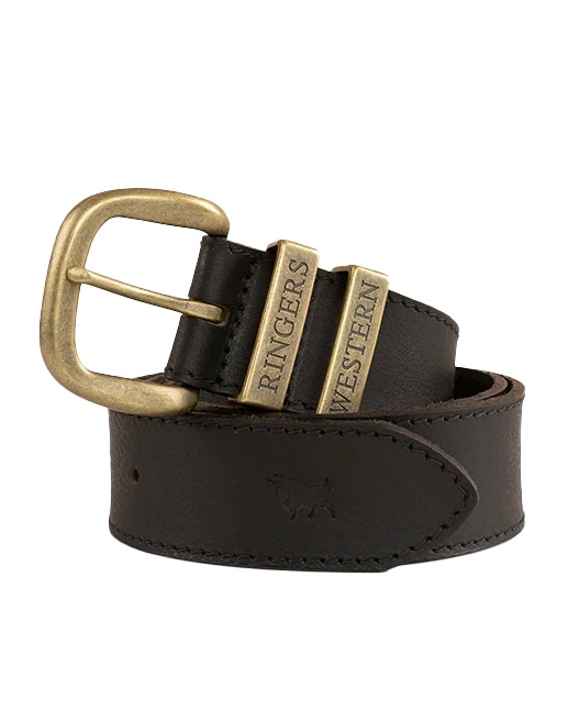 Made with black leather and gold matte brass, the James is the perfect corporate and dress belt. Featuring a subtle embossed signature bull on the tail and intricate Ringers Western engraving for a luxurious finish.