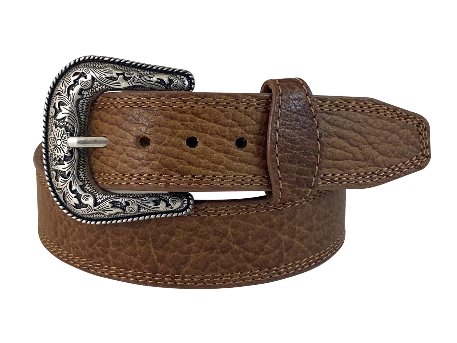 A leather western belt with an embossed antique nickel buckle. A great finish for any outfit.