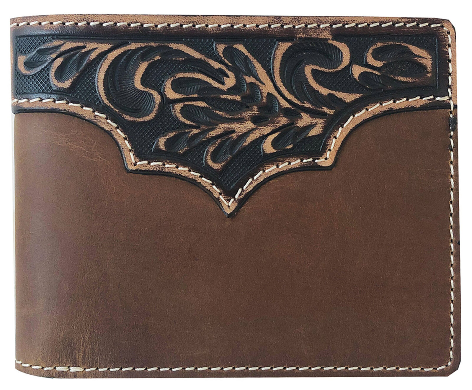 There's nothing quite like a quality leather wallet. They age beautifully, and they live a long life! This one features a tooled yoke design and contrasting stitching.