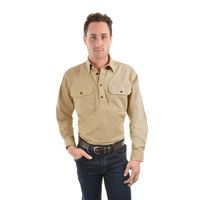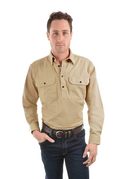 A classic work shirt, the half button is a much loved alternative to a full button shirt for country people, workers and tradies all over Australia. They're easy on/off (less buttons) and safer because there are no shirt-tails to get caught in machinery or on fences!