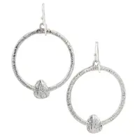 Turquoise is always the perfect touch for any western outfit. These Montana Silversmith 'Turquoise Touch' Attitude Earrings feature a silver toned round shape with etched Southwestern designs for a bold mesmerizing look. At the bottom of each circlet is a single triangular crafted turquoise stone with an antiqued, silver toned, beaded border.